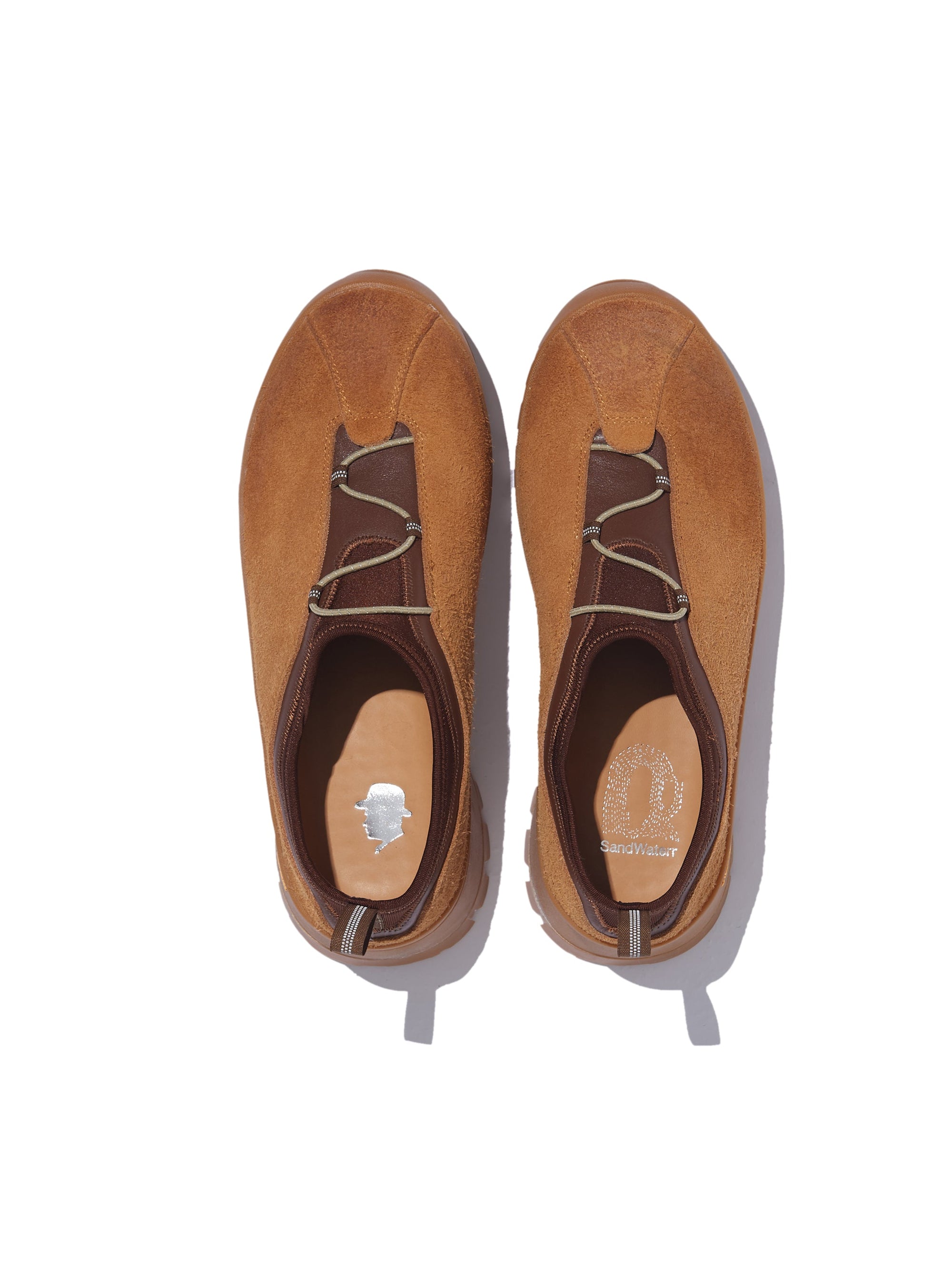"Tomo&Co"に別注したスニーカー。インラインにあるものを素材、パーツ、ステッチをよりアウトドアライクにアレンジしました。インソールのデザインはオリジナルのプリントが入ります。厚底のVIBRAM社の884Cのソールを使用。ガムカラーのソールは再生ラバーを使用し、一点一点違う表情のソールになります。