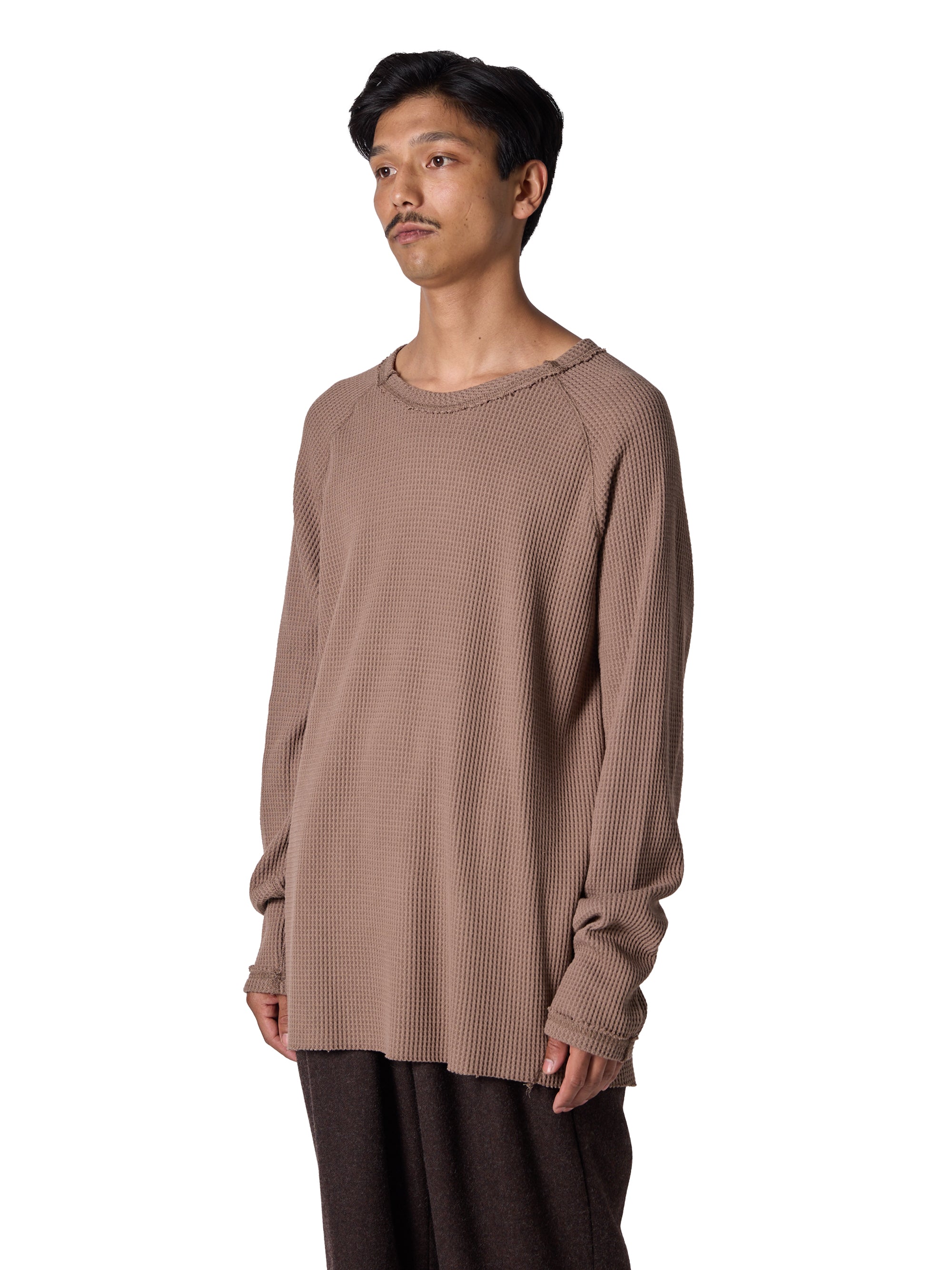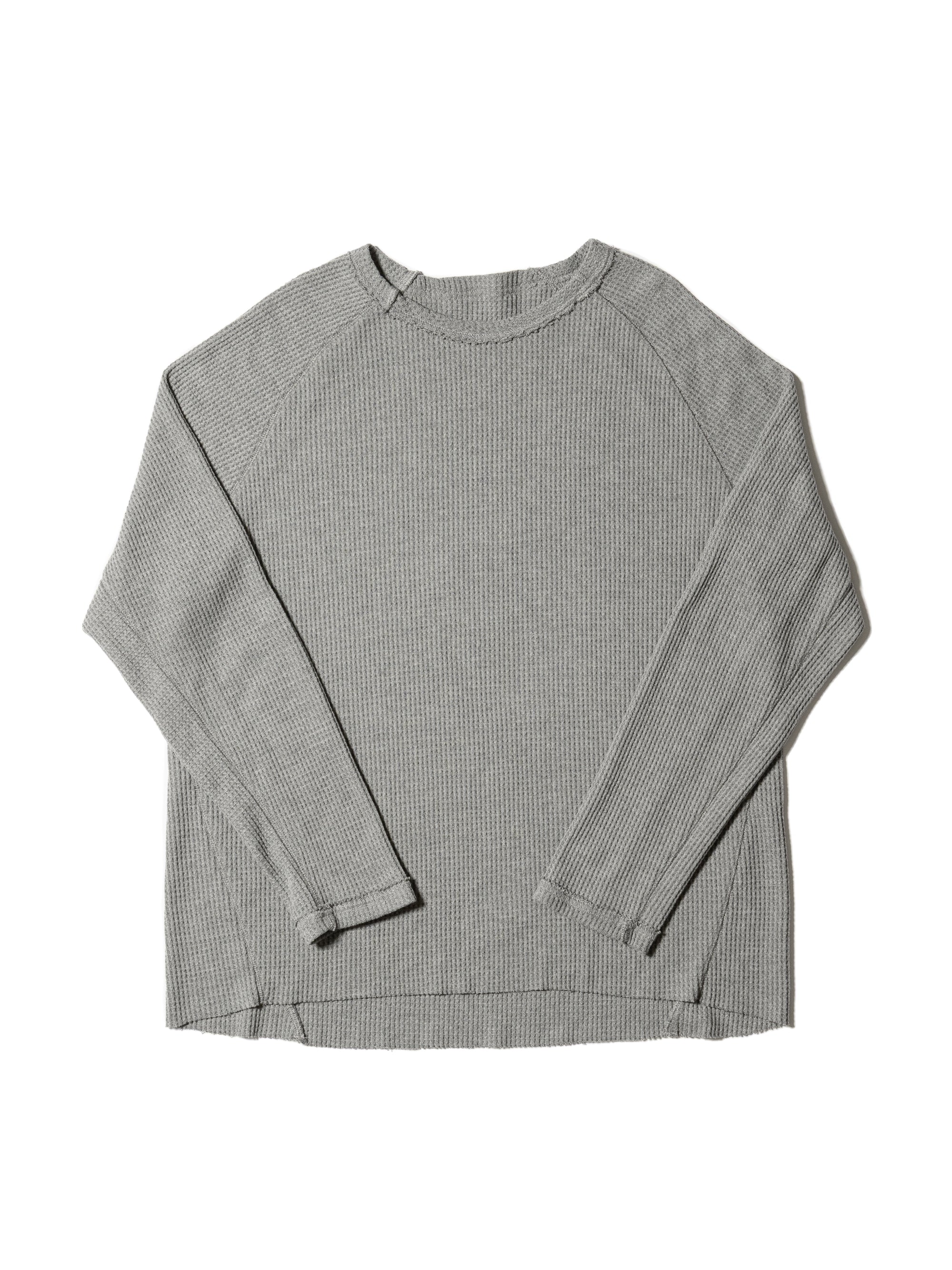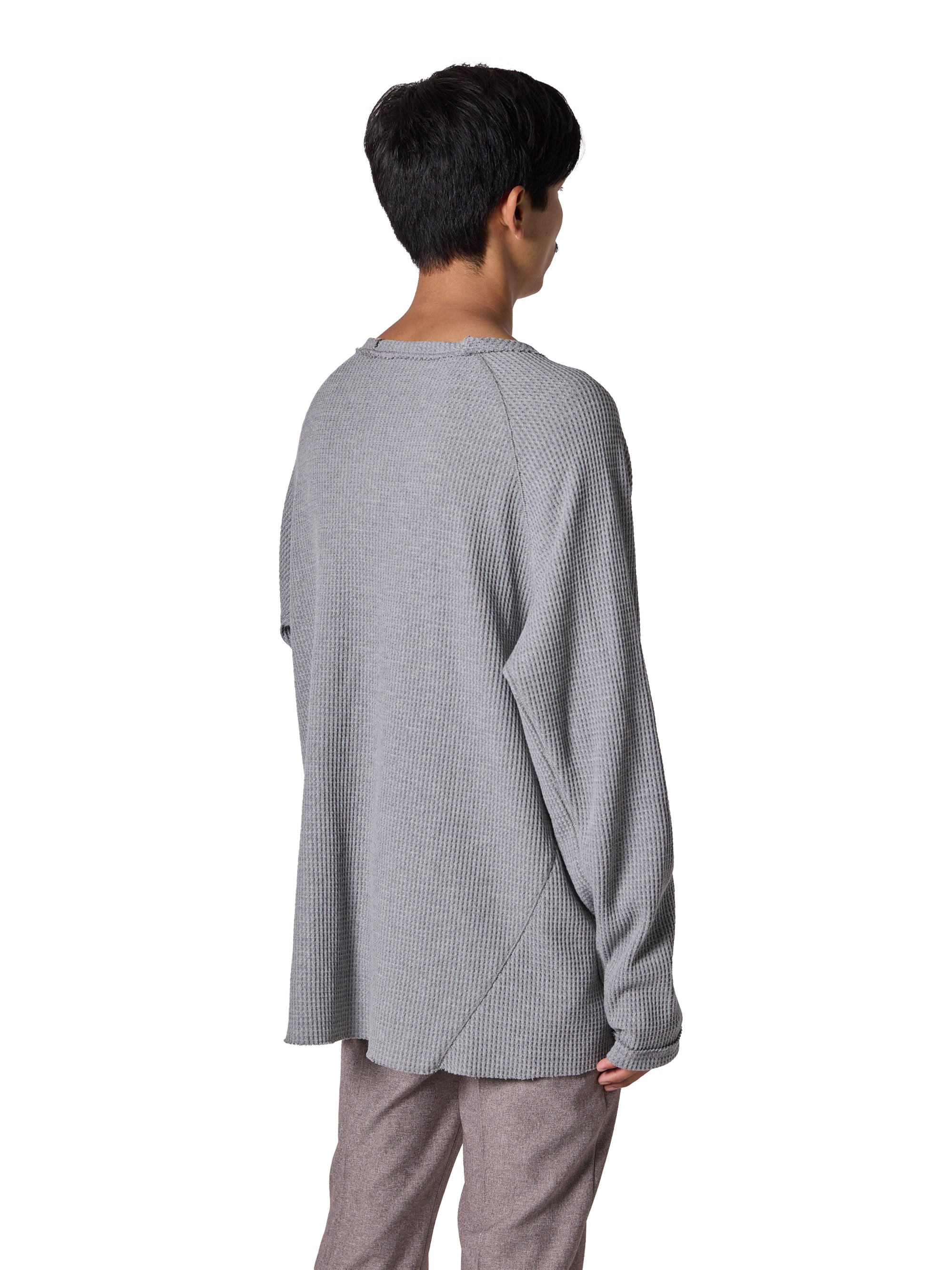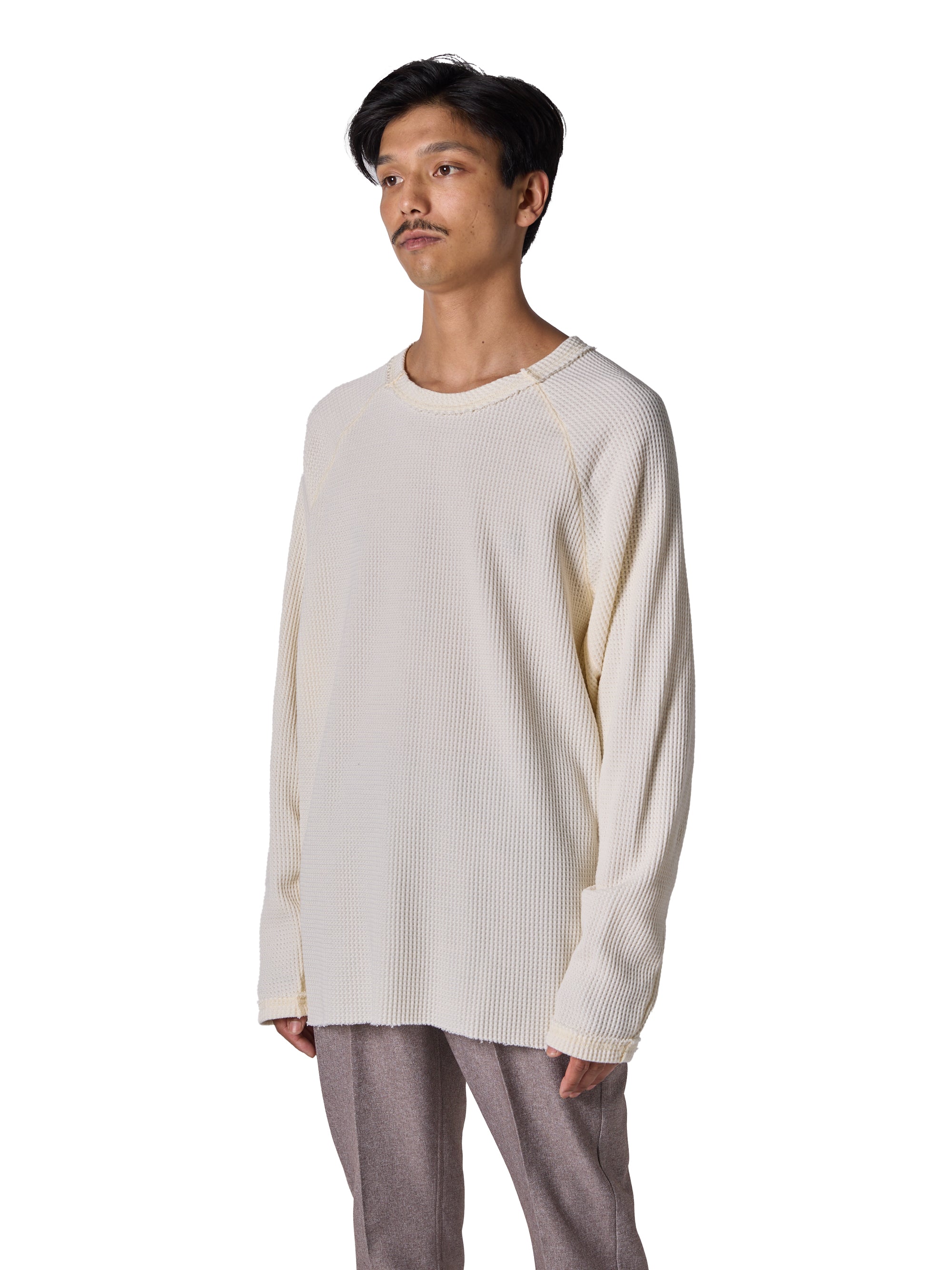 柔らかく、保温性の高いサーマル地を使用しています。身幅にゆとりのあるバギーシルエットになります。
