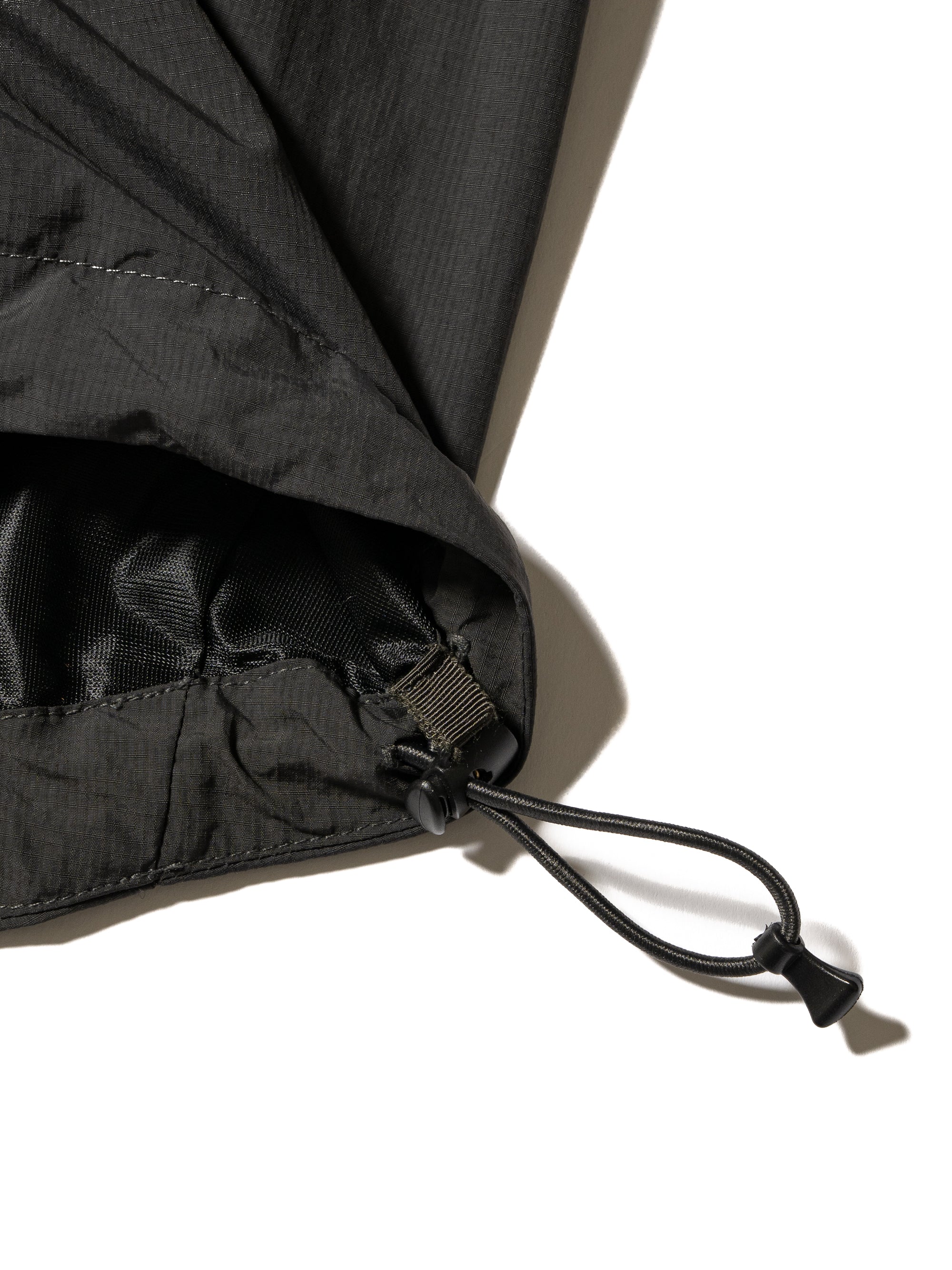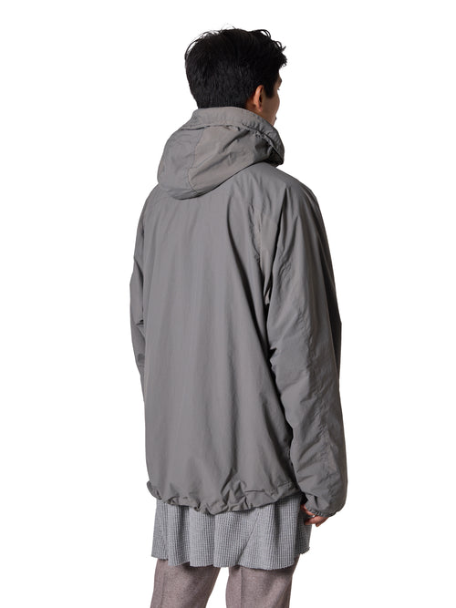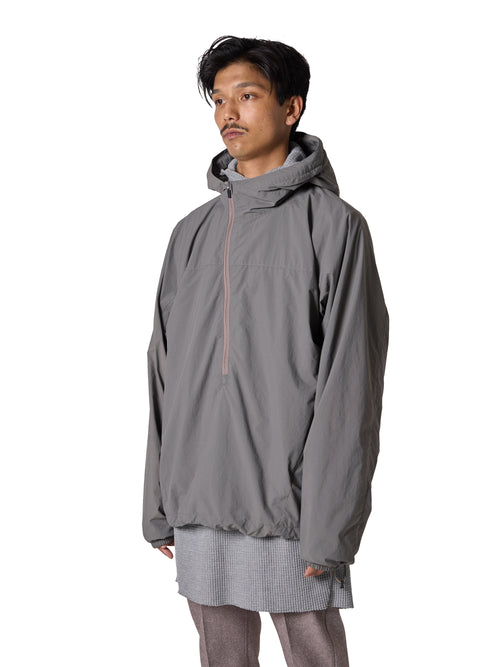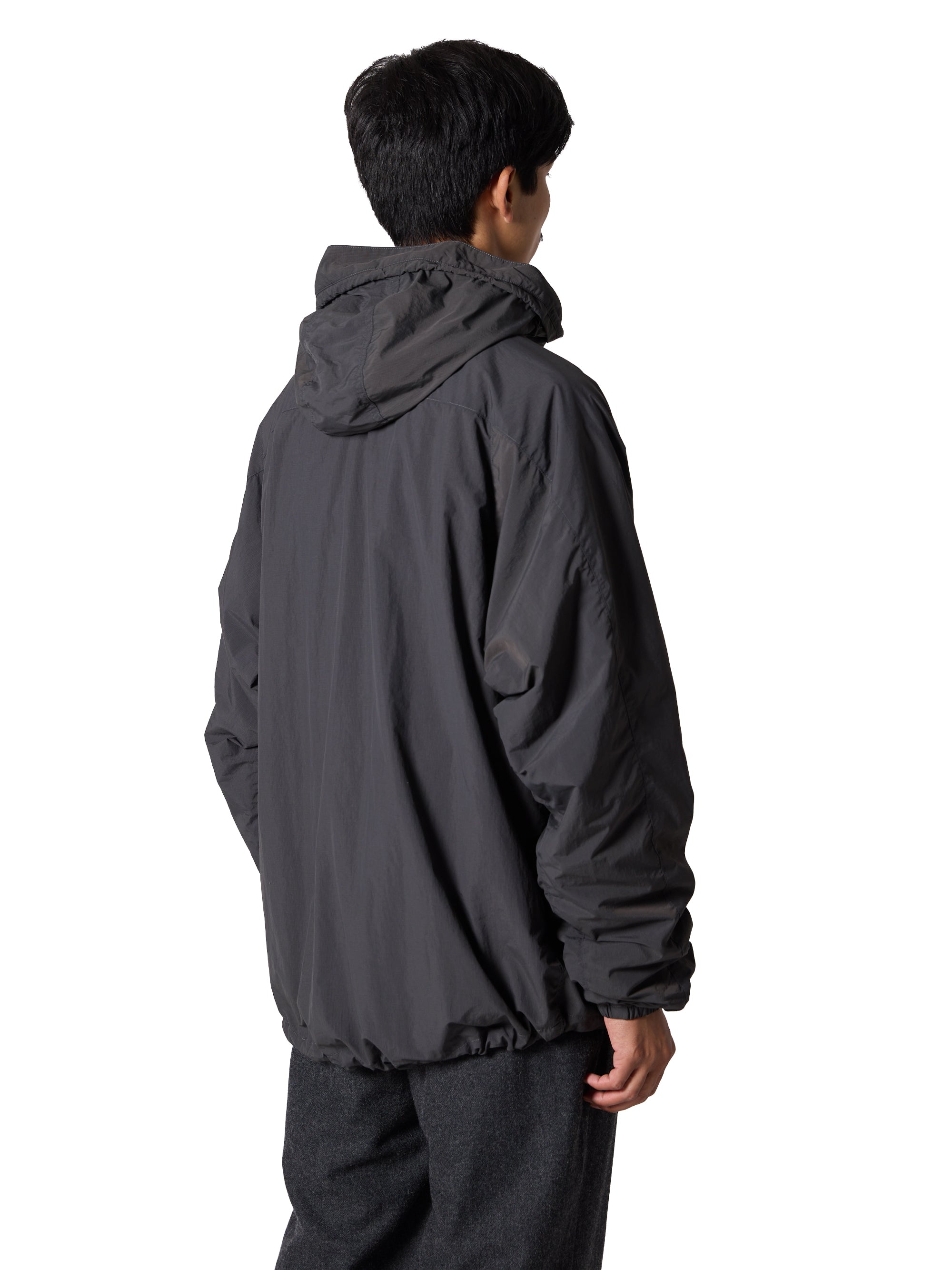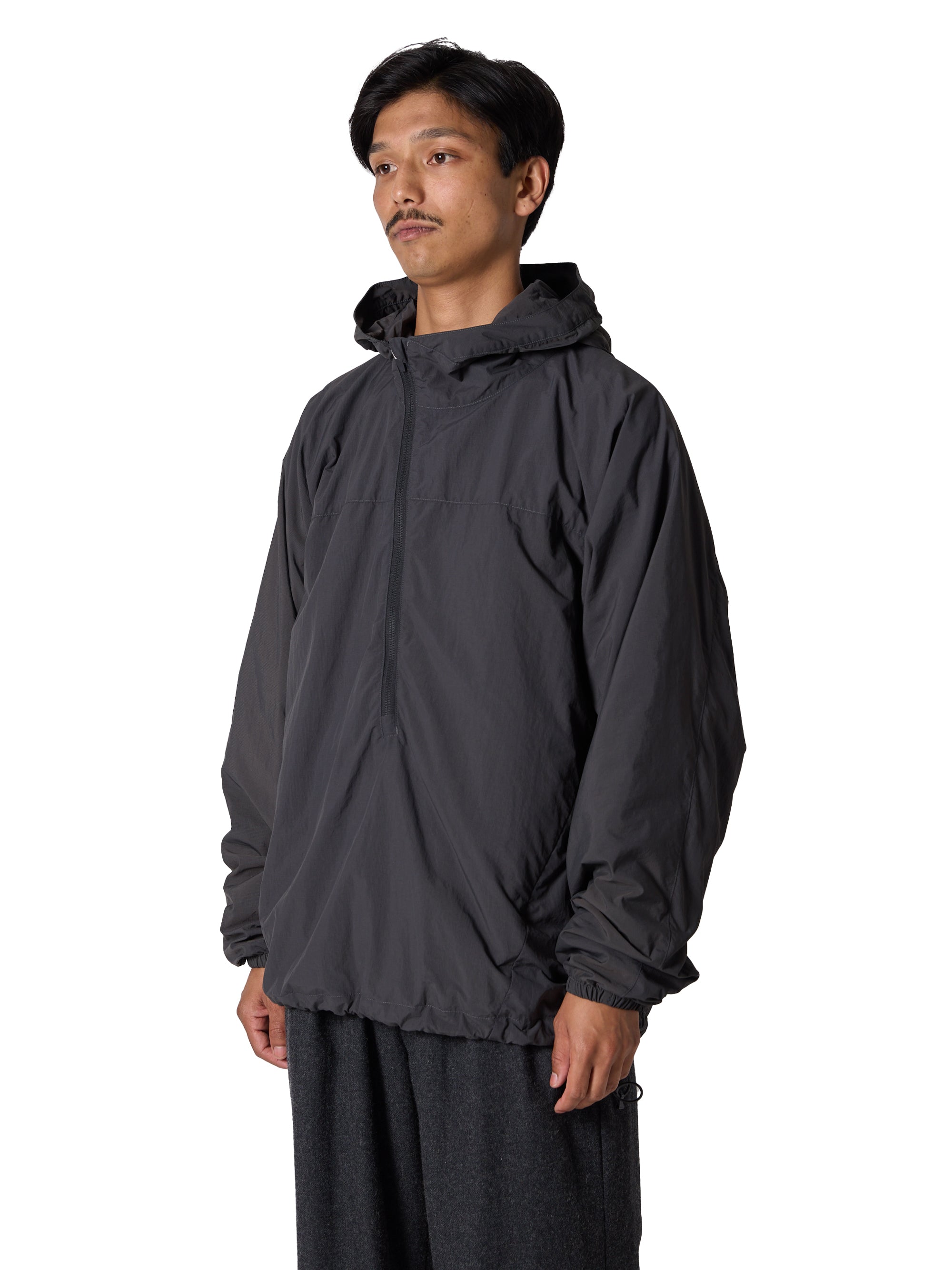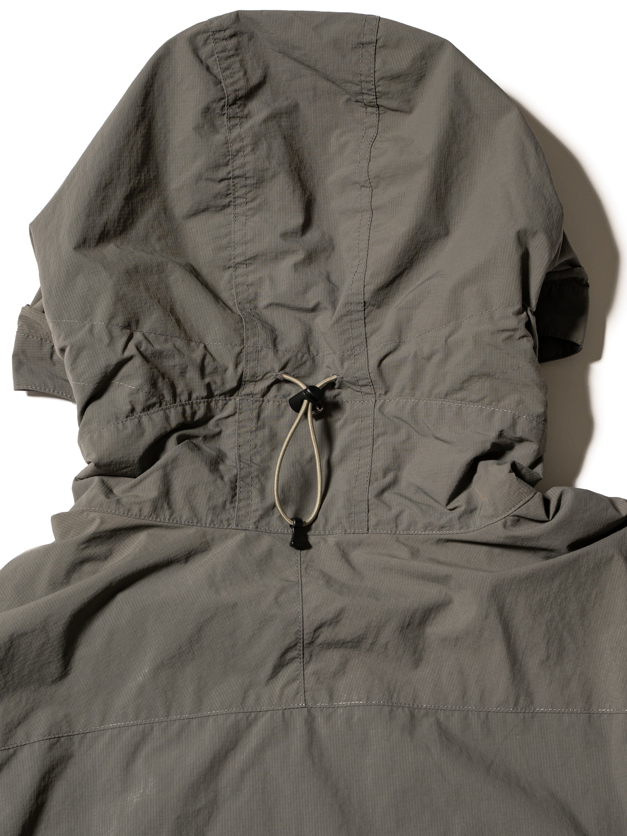 細かい格子状に織り込まれたリップストップナイロンを使用。耐久性が高く、軽量な上に、撥水、防風に優れています。製品にウォッシュ加工を施し、程よいシワが出るよう仕上げています。身幅にゆとりあるプルオーバータイプ。裏地をつけて防寒性も備えています。各所にドローコードでシルエットを調節できます。ワンウォッシュ加工を施しています。