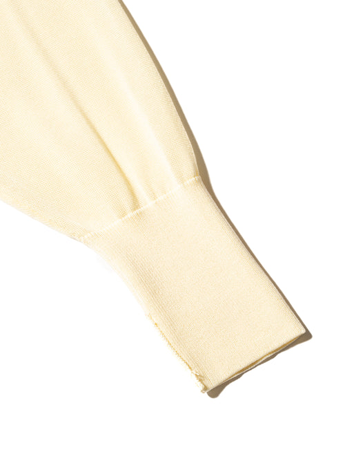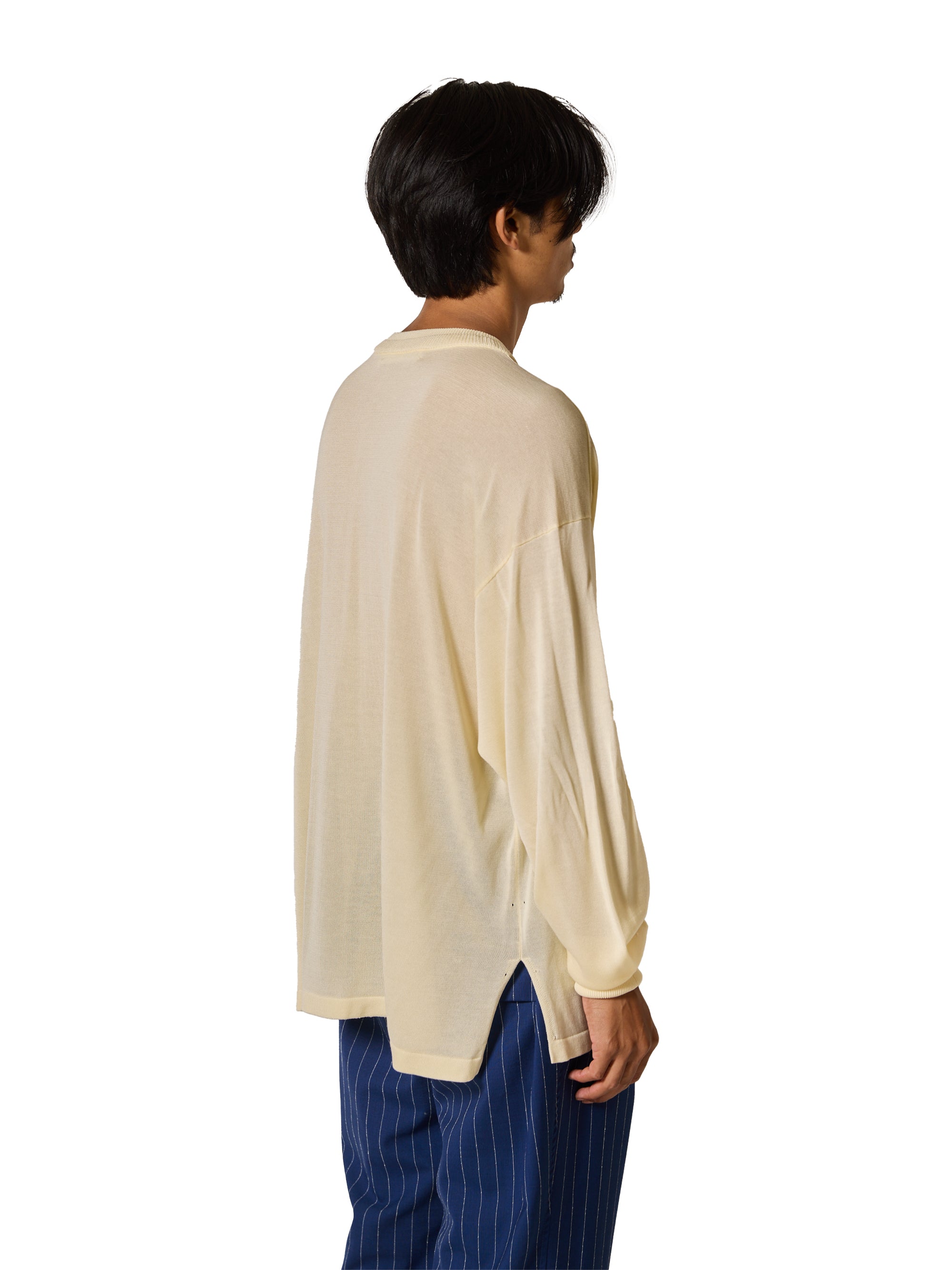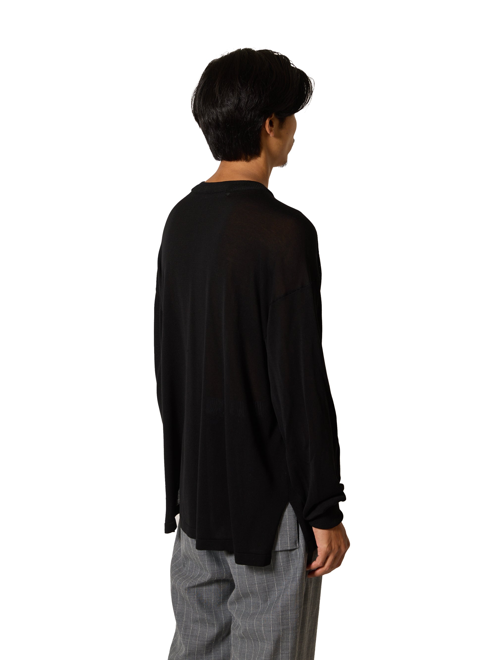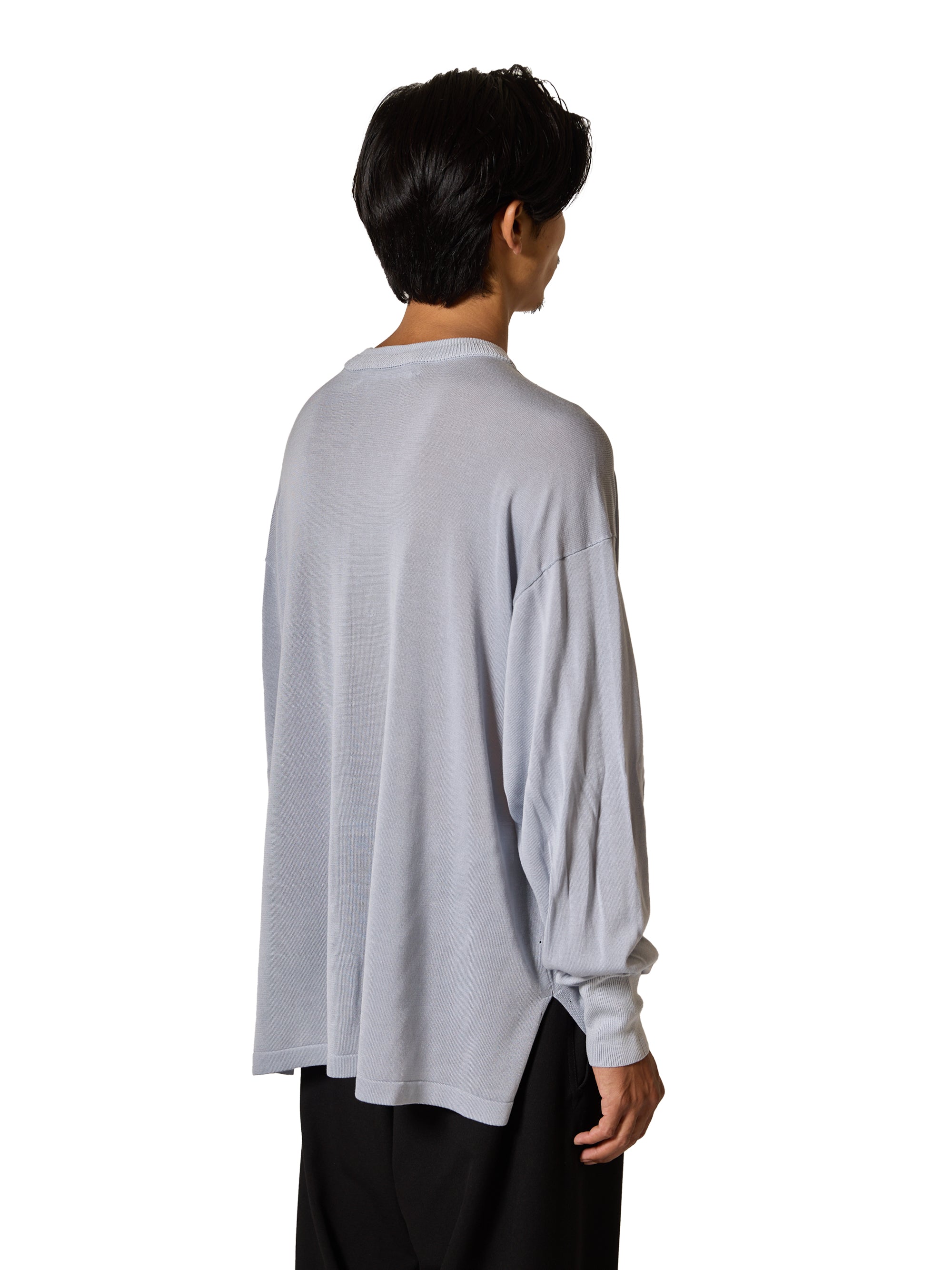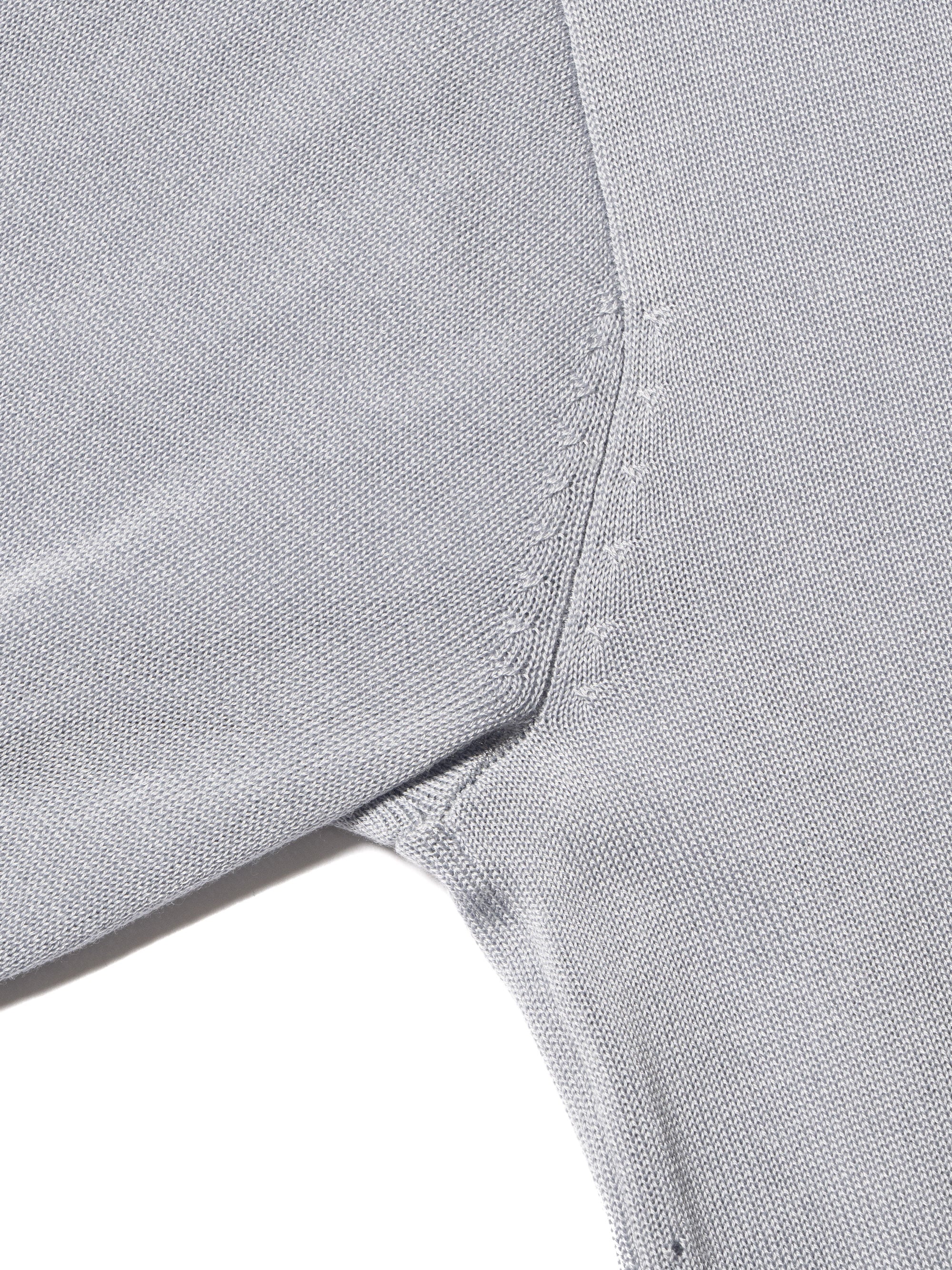 再生繊維(セルソース)、レーヨンをミックスした糸を使用しています。抗菌、冷感の機能も兼ね備えています。ハイゲージな天竺編みにして程よい光沢感を出し、滑らかな肌触りにしています。襟は針抜きリブ仕様にしています。程よい身幅のシルエットです。