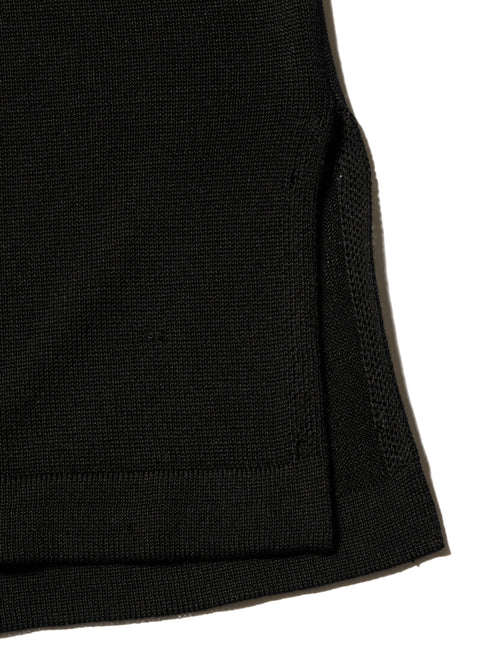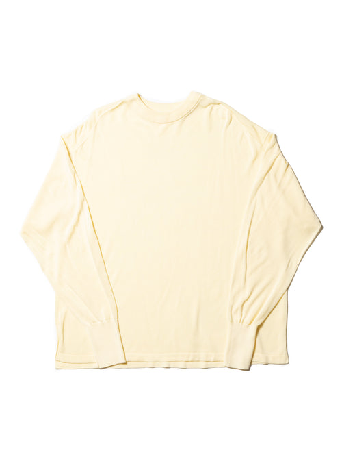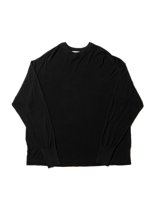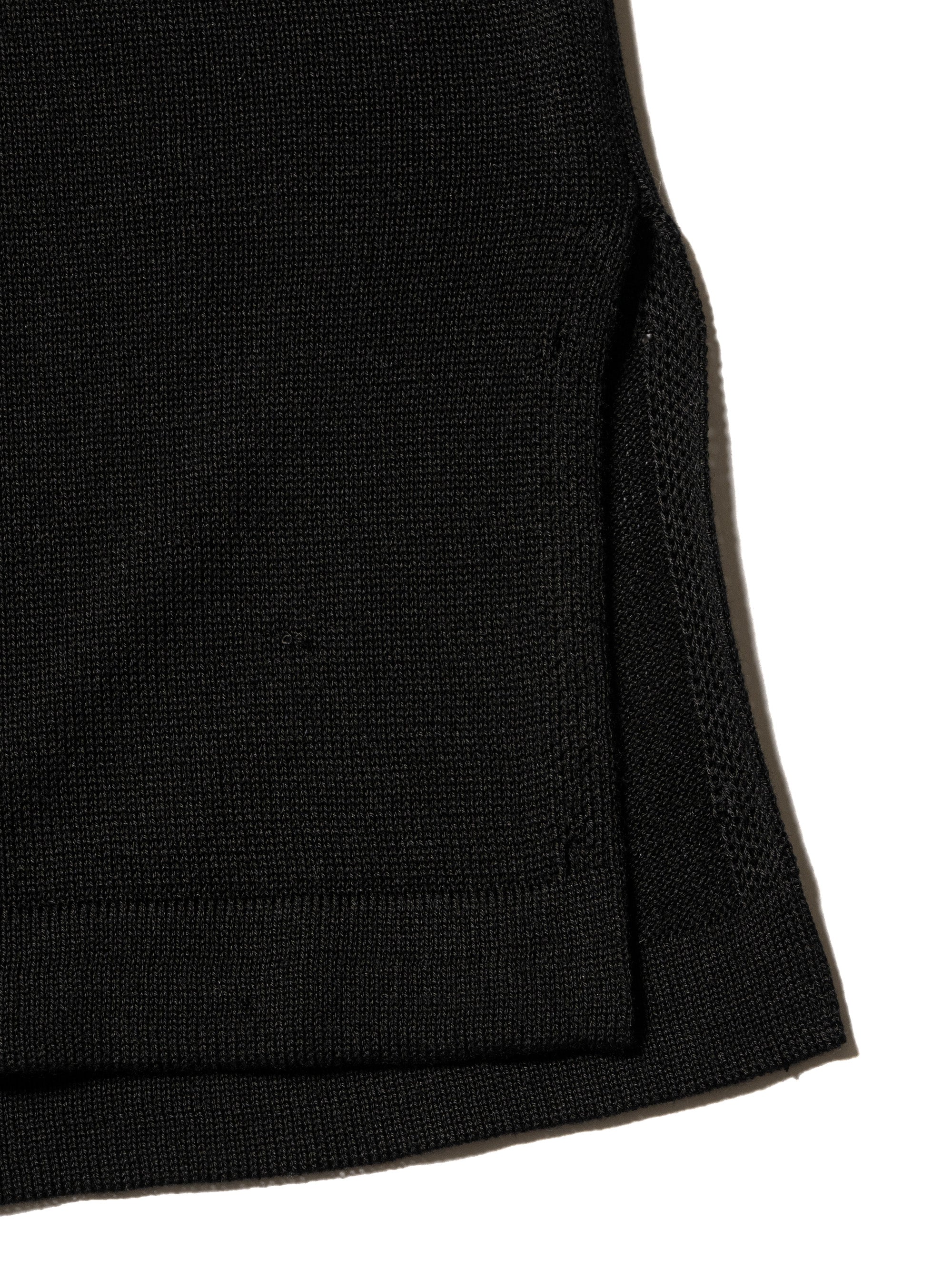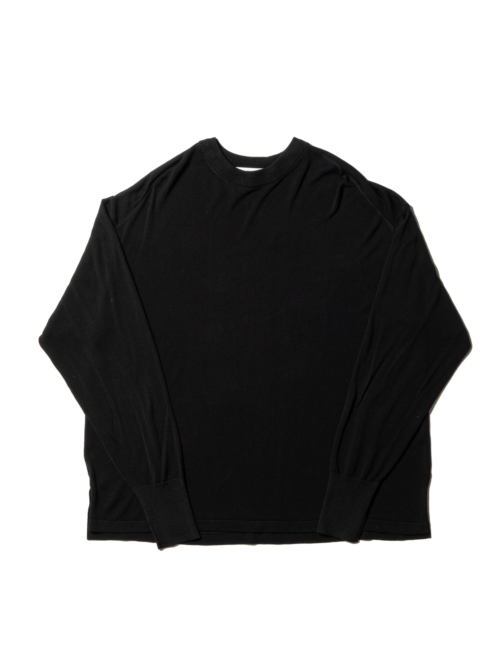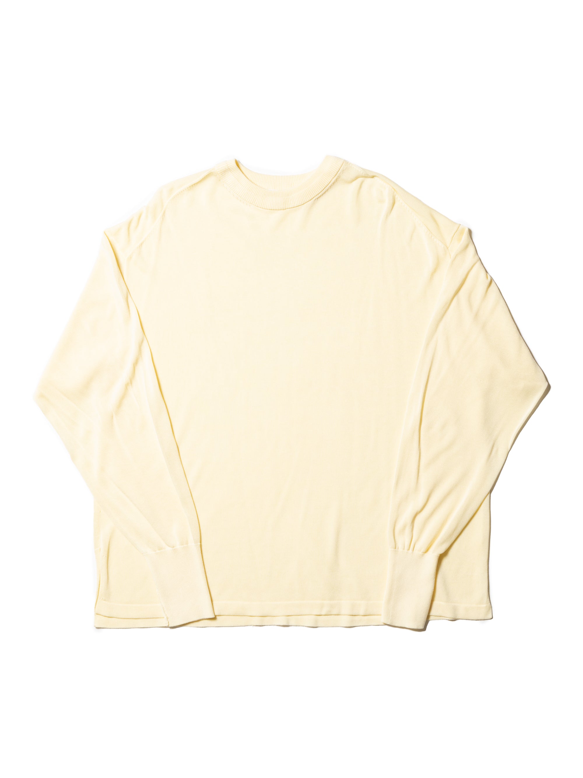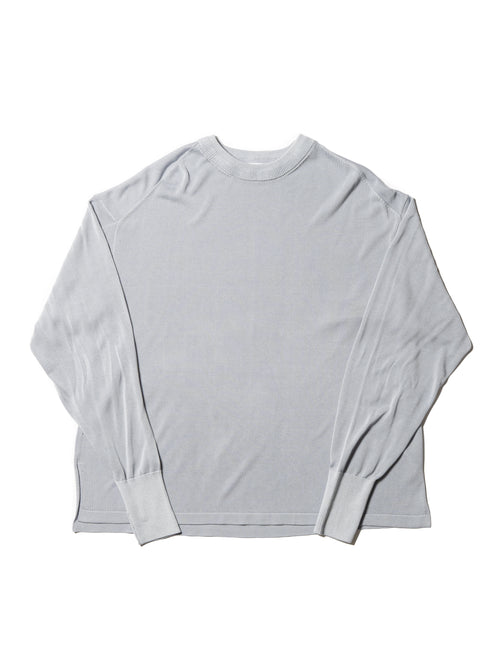 再生繊維(セルソース)、レーヨンをミックスした糸を使用しています。抗菌、冷感の機能も兼ね備えています。ハイゲージな天竺編みにして程よい光沢感を出し、滑らかな肌触りにしています。襟は針抜きリブ仕様にしています。程よい身幅のシルエットです。