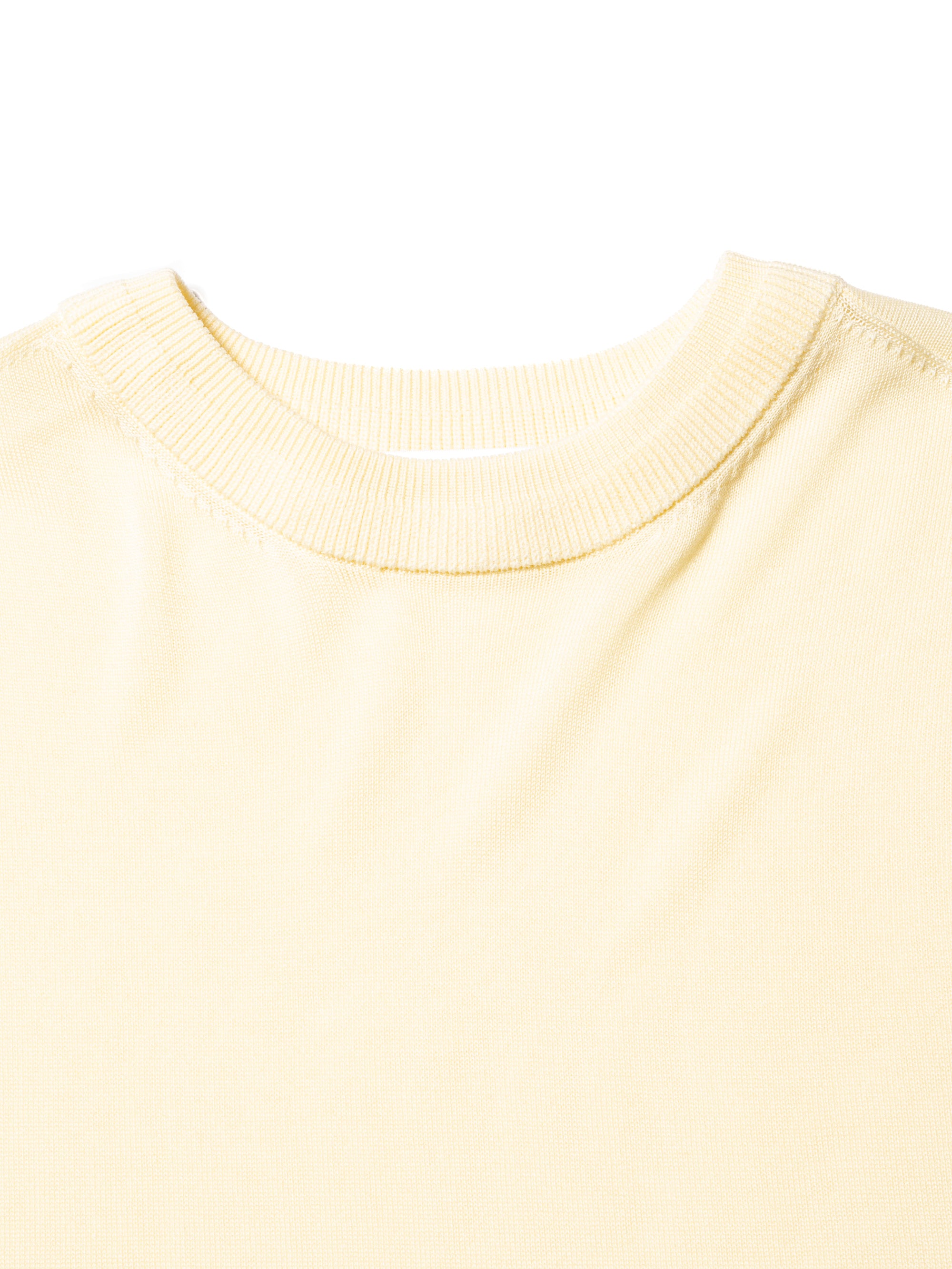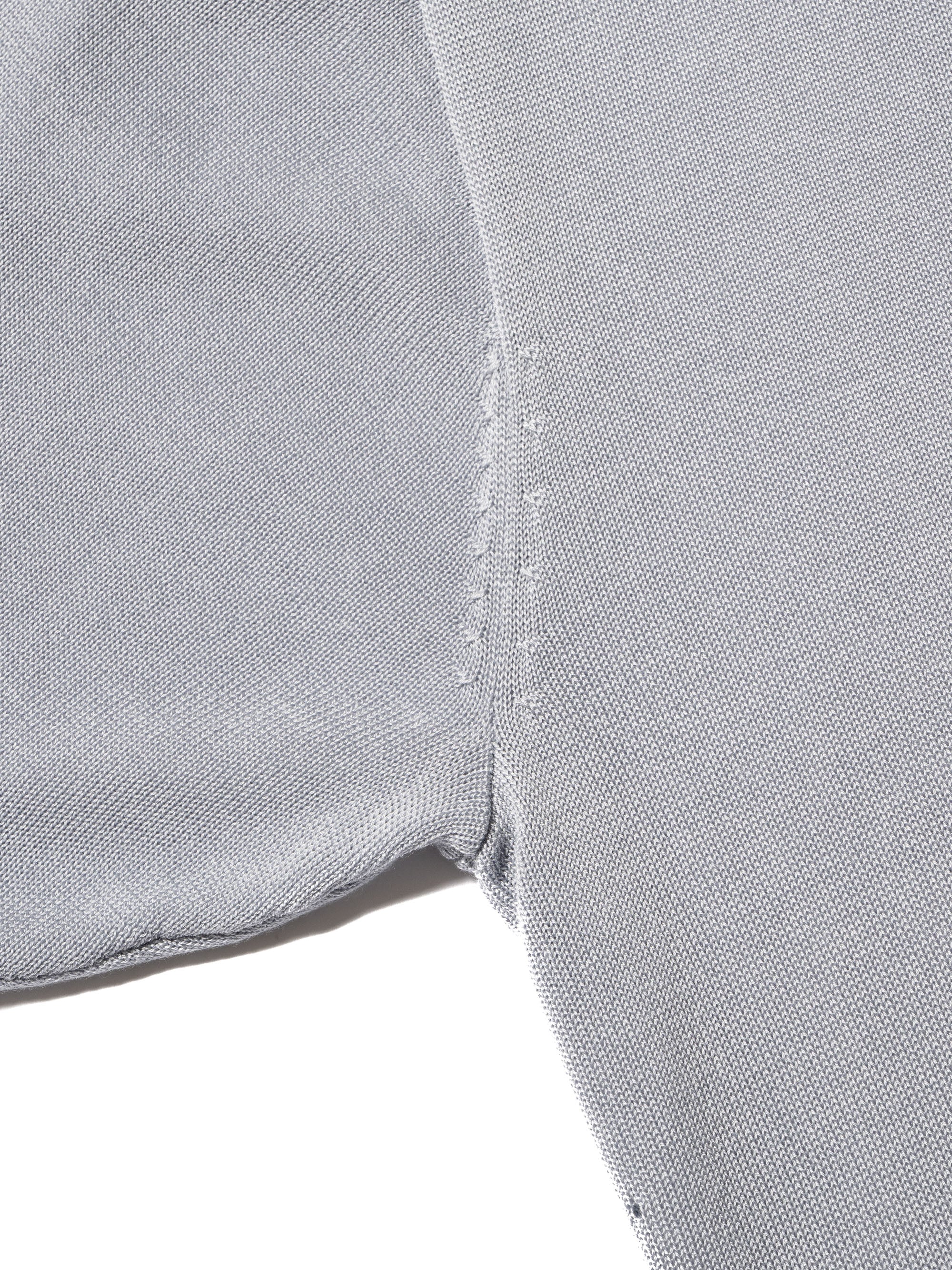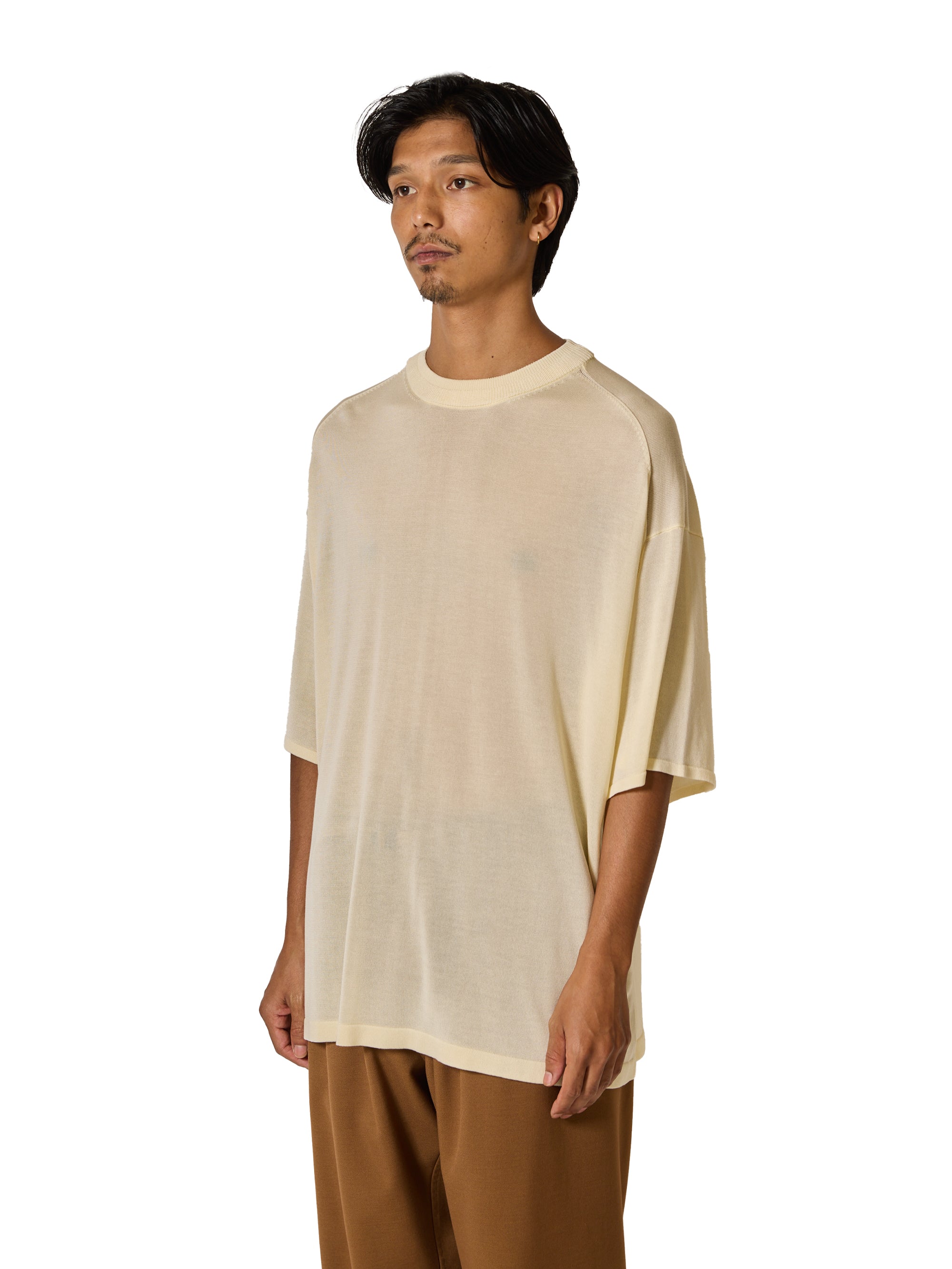 再生繊維(セルソース)、レーヨンをミックスした糸を使用しています。抗菌、冷感の機能も兼ね備えています。ハイゲージな天竺編みにして程よい光沢感を出し、滑らかな肌触りにしています。襟は針抜きリブ仕様にしています。程よい身幅のシルエットです。