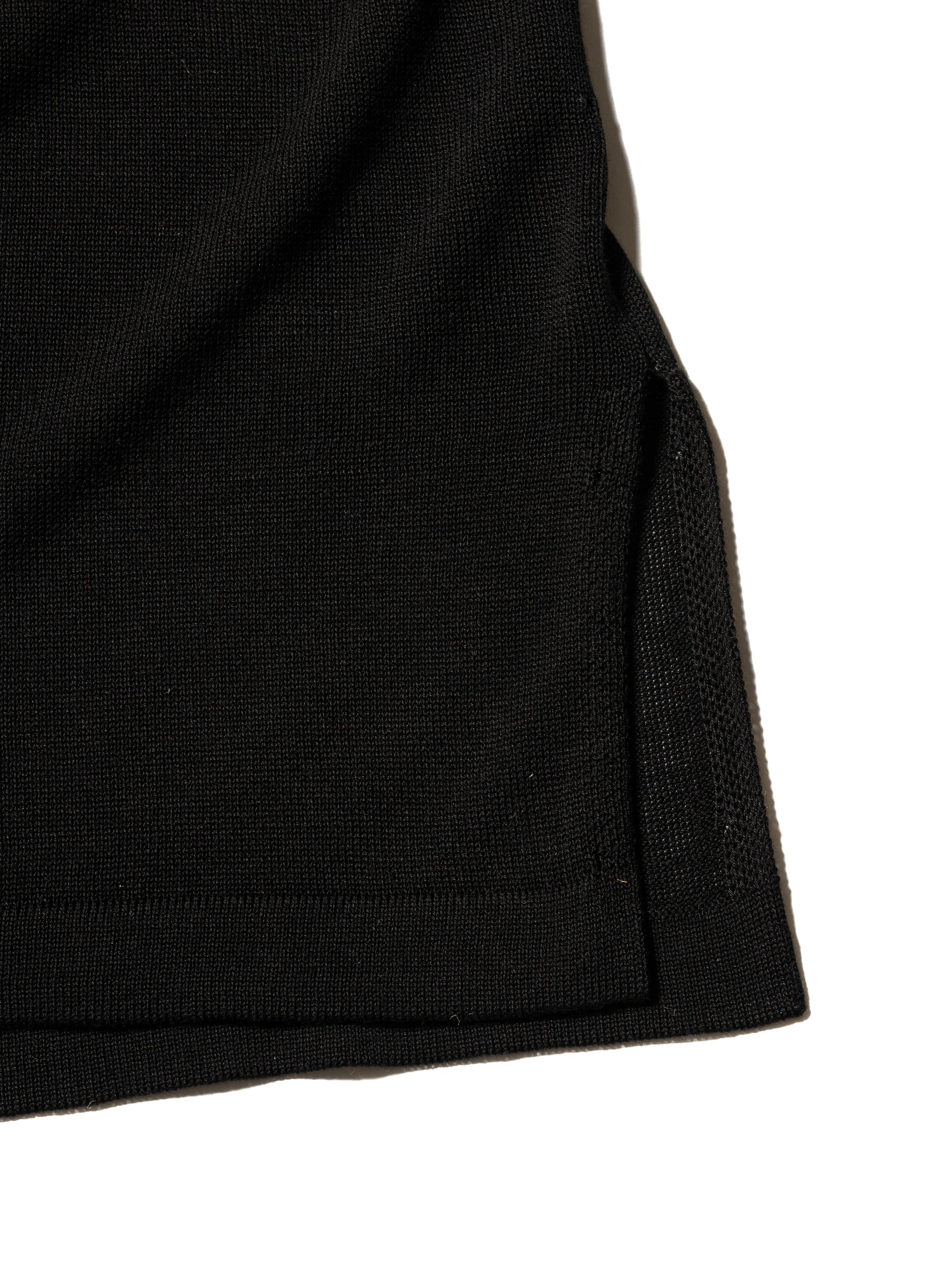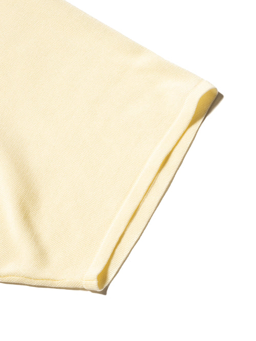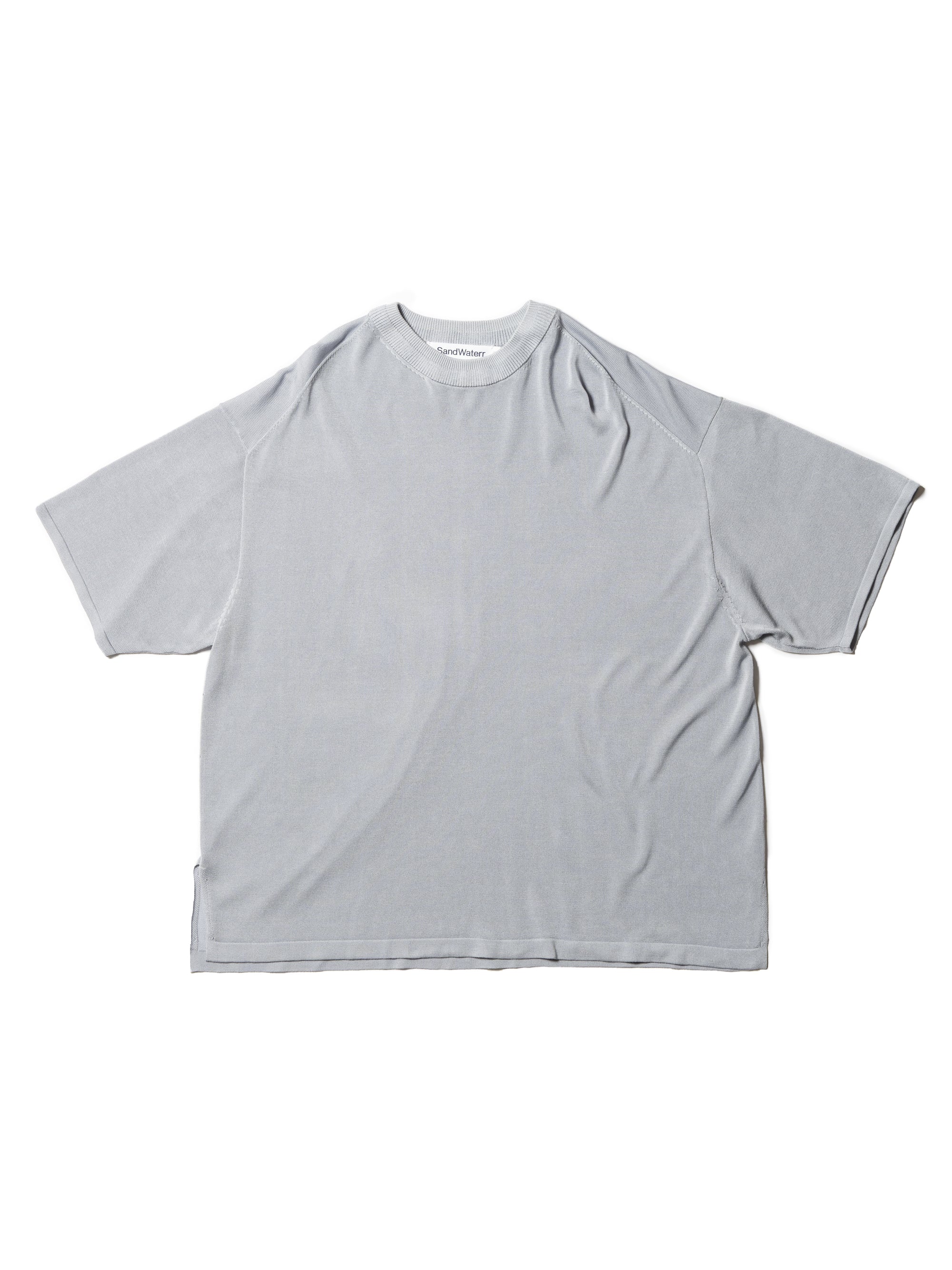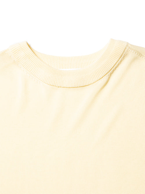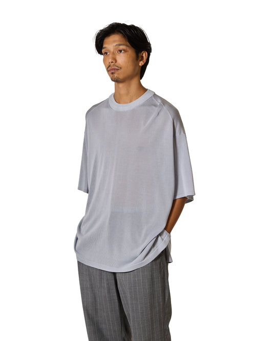 再生繊維(セルソース)、レーヨンをミックスした糸を使用しています。抗菌、冷感の機能も兼ね備えています。ハイゲージな天竺編みにして程よい光沢感を出し、滑らかな肌触りにしています。襟は針抜きリブ仕様にしています。程よい身幅のシルエットです。