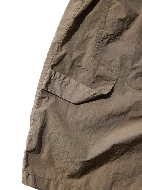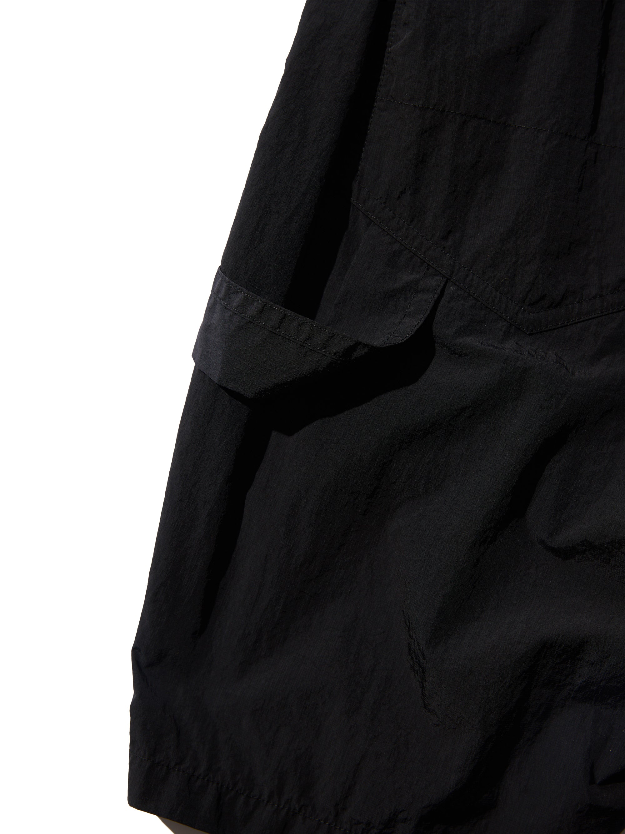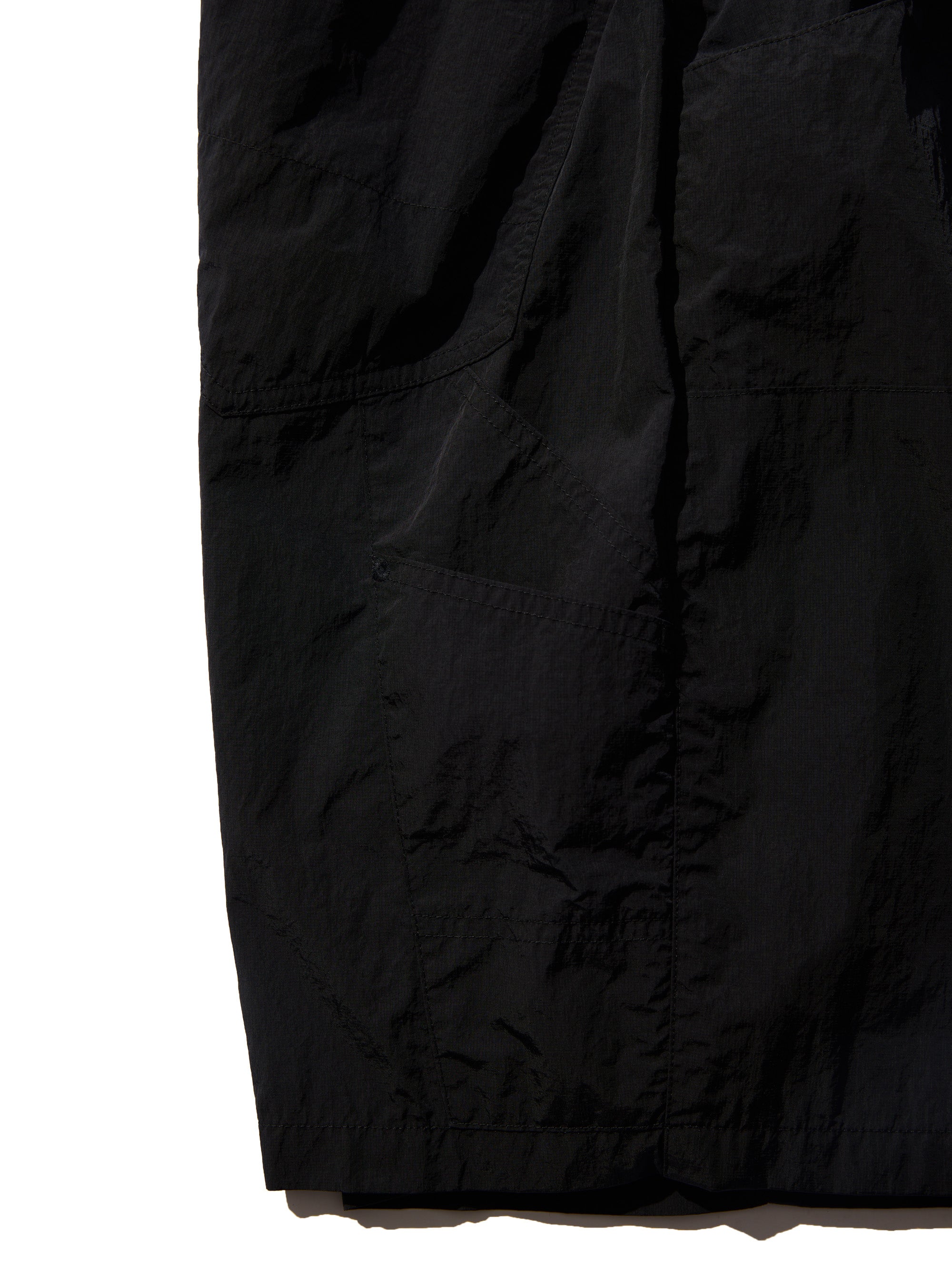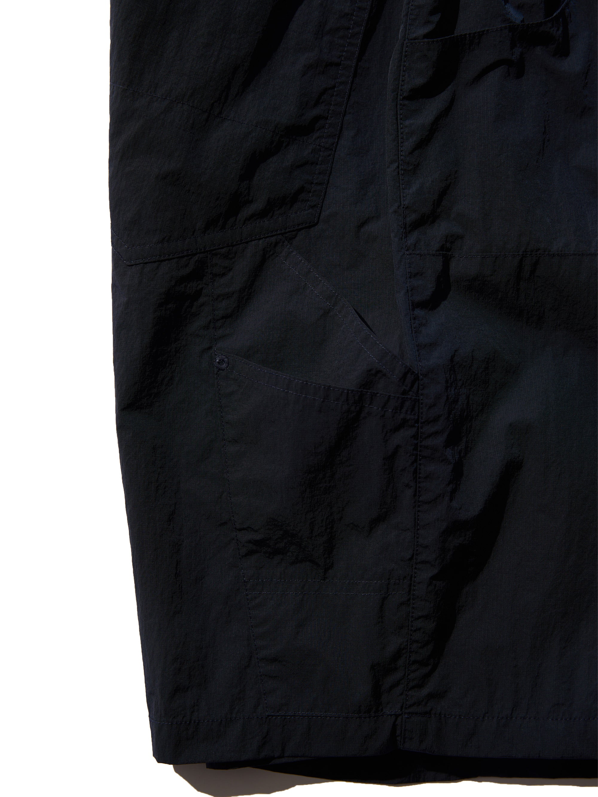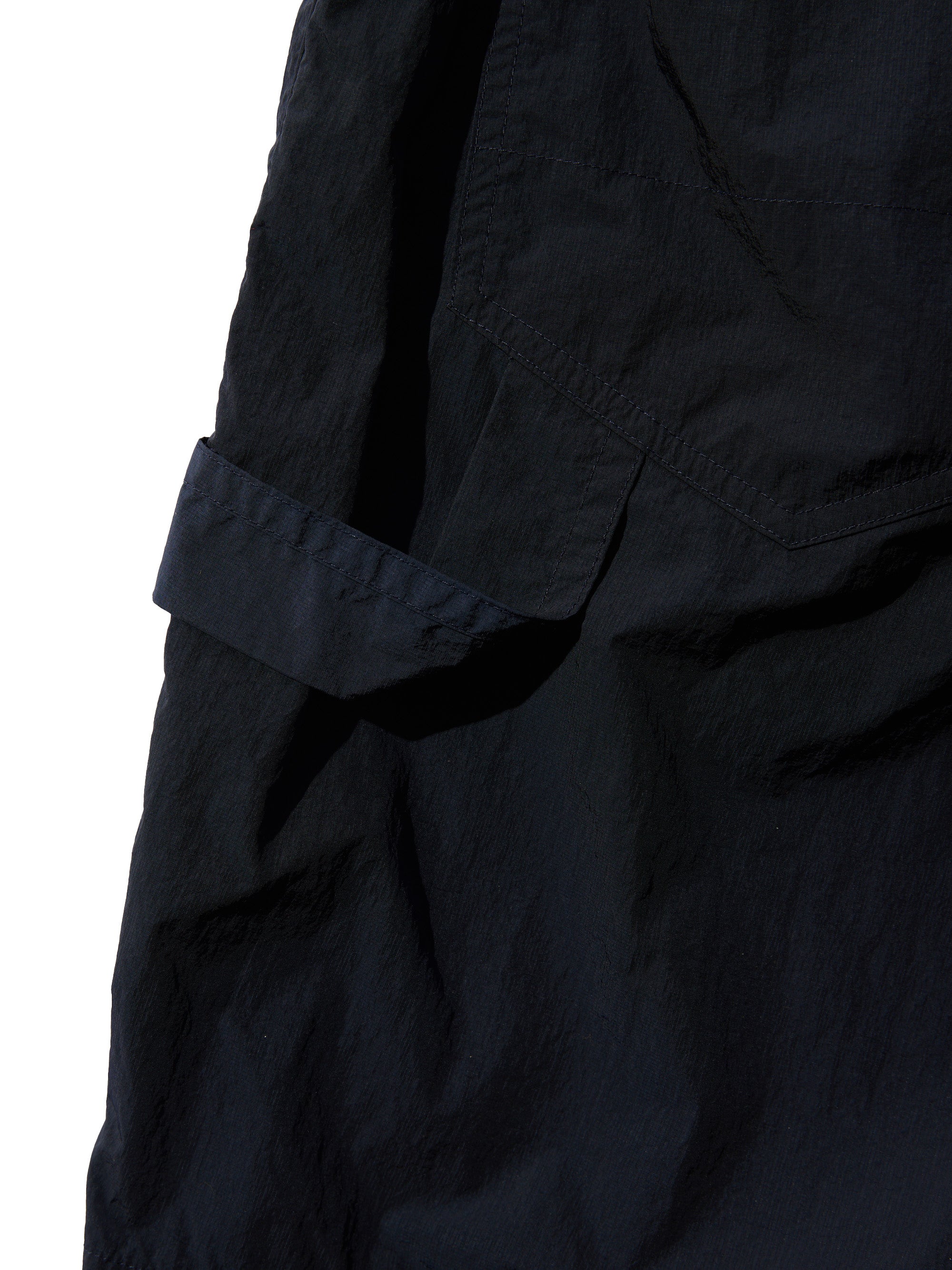 格子状に織り込まれたリップストップナイロンを使用。耐久性が高く、軽量な上に、撥水、防風に優れています。製品にウォッシュ加工を施し、程よいシワが出るよう仕上げています。膝部分に補強で生地をあてています。ウエストはイージー仕様です。