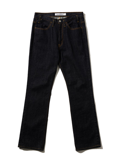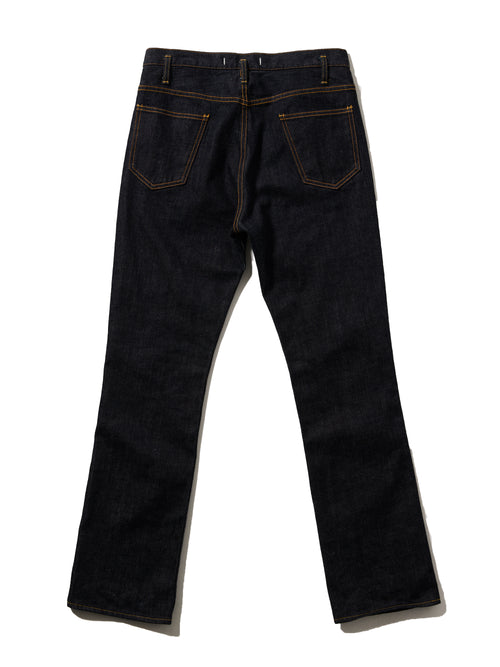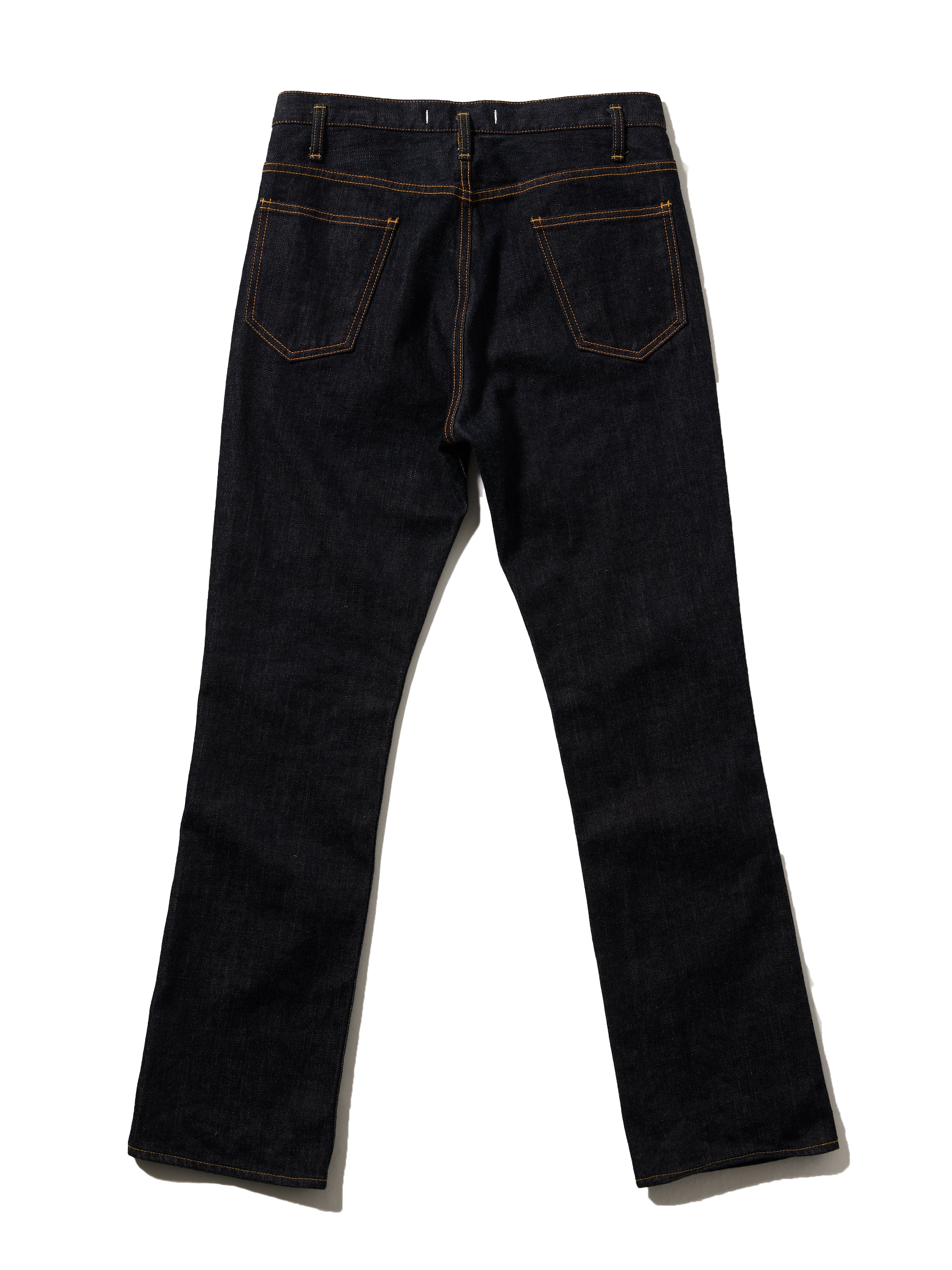 岡山県、児島で作製されたデニムパンツ。綿100%の風合いを崩さずポリウレタンが1%がミックスされたことでフィット感、機能性が優れています。膝幅を絞り、裾幅を若干広げた絶妙なブーツカット。ワンウォッシュ加工を施しています。ヴィンテージ加工に比べ若干ゆとりのあるサイズ感です。