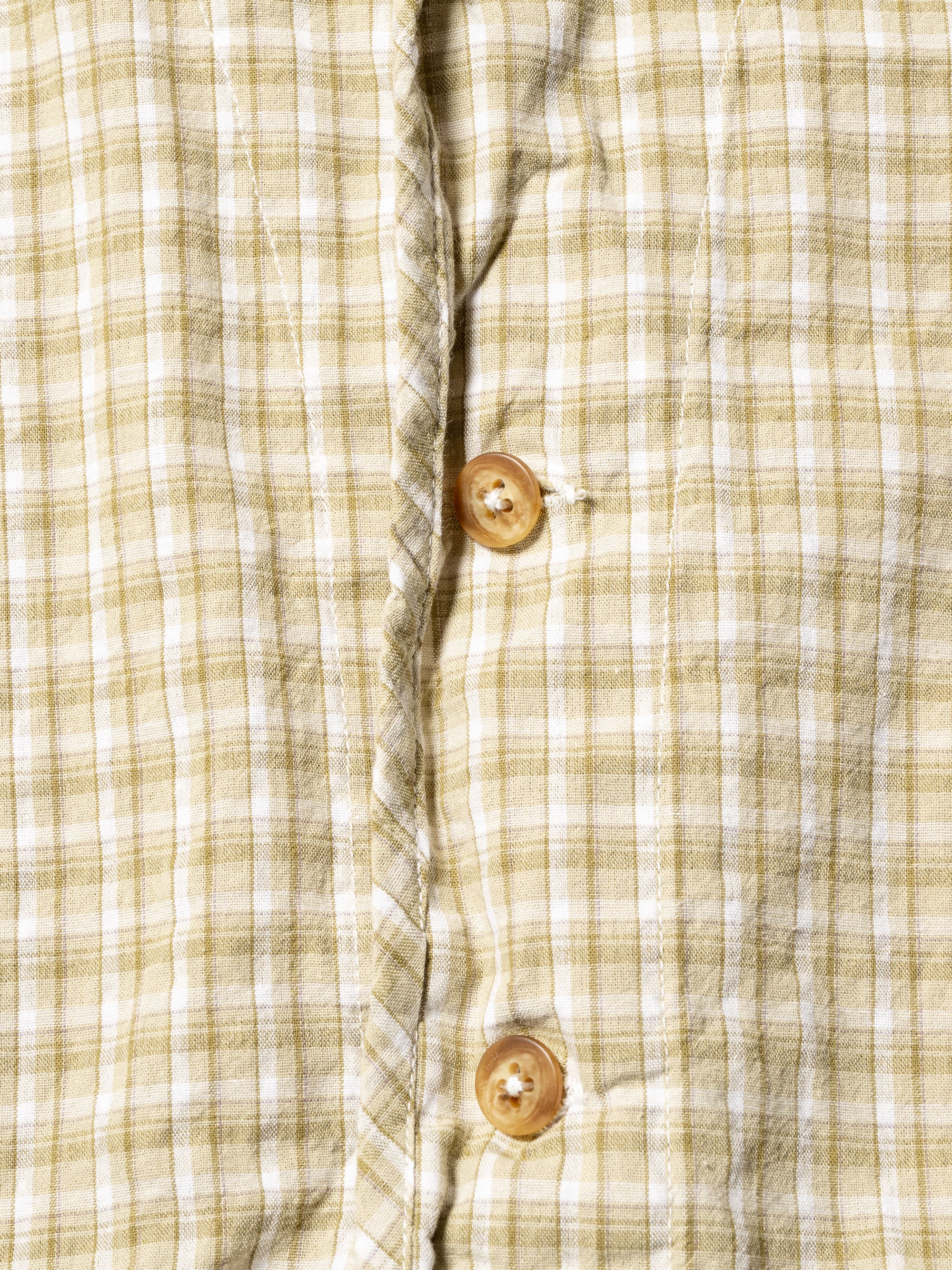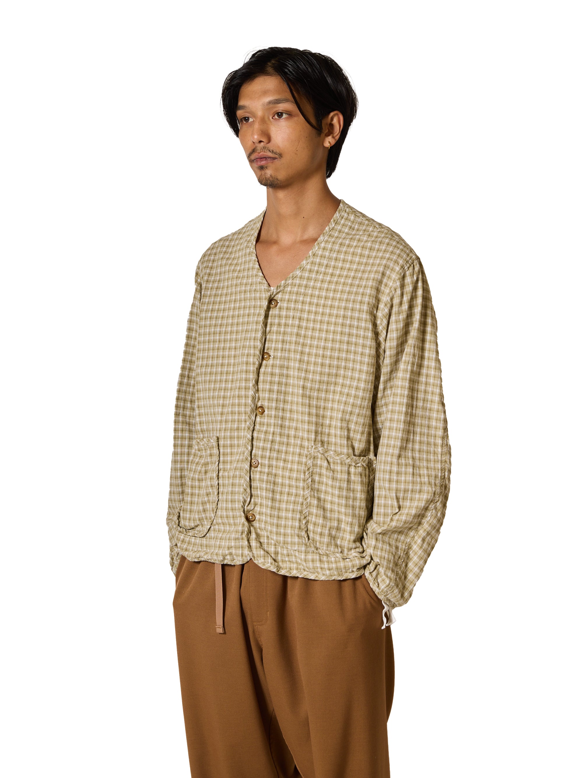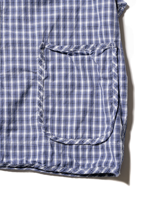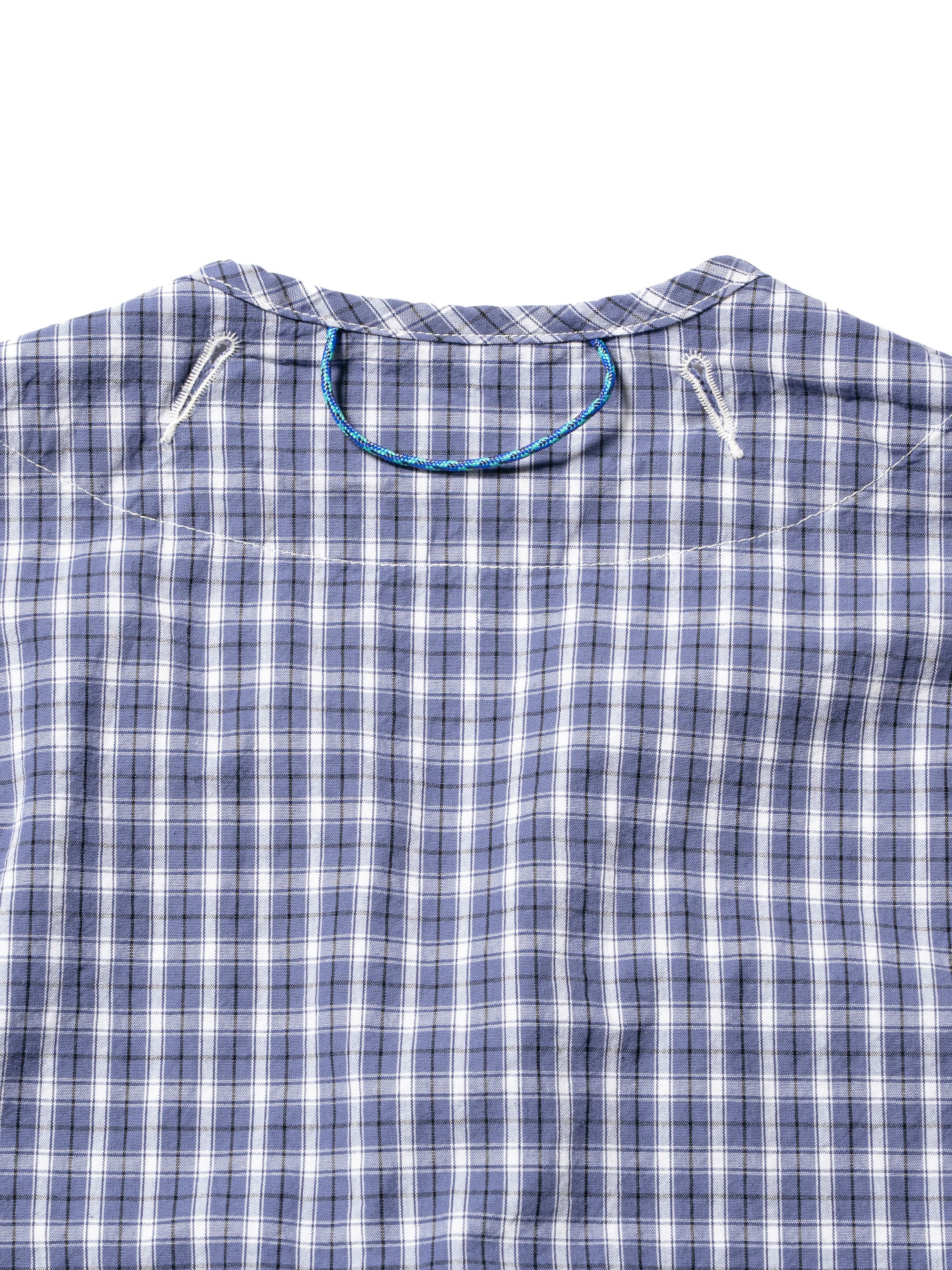 コットン100%のチェック柄ブロード地を使用しています。ウォッシュ加工を施し、古着の様な愛着ある風合いにしています。身幅にゆとりあるショート丈のボックスシルエット。襟ぐりにあるボタンホール、袖口のテープパーツを使い、"M51"モッズパーカーに装着できるディテールを備えています。
