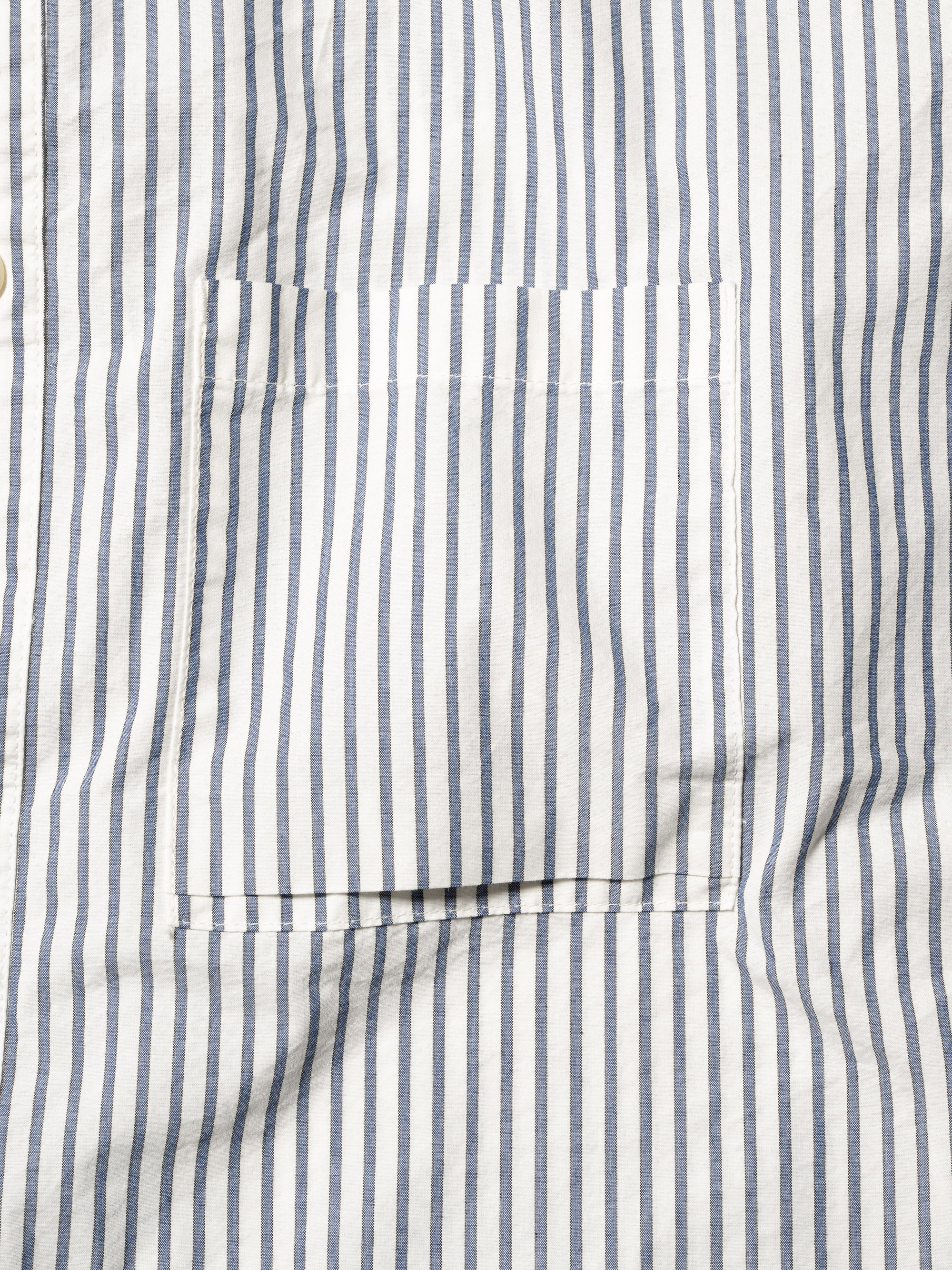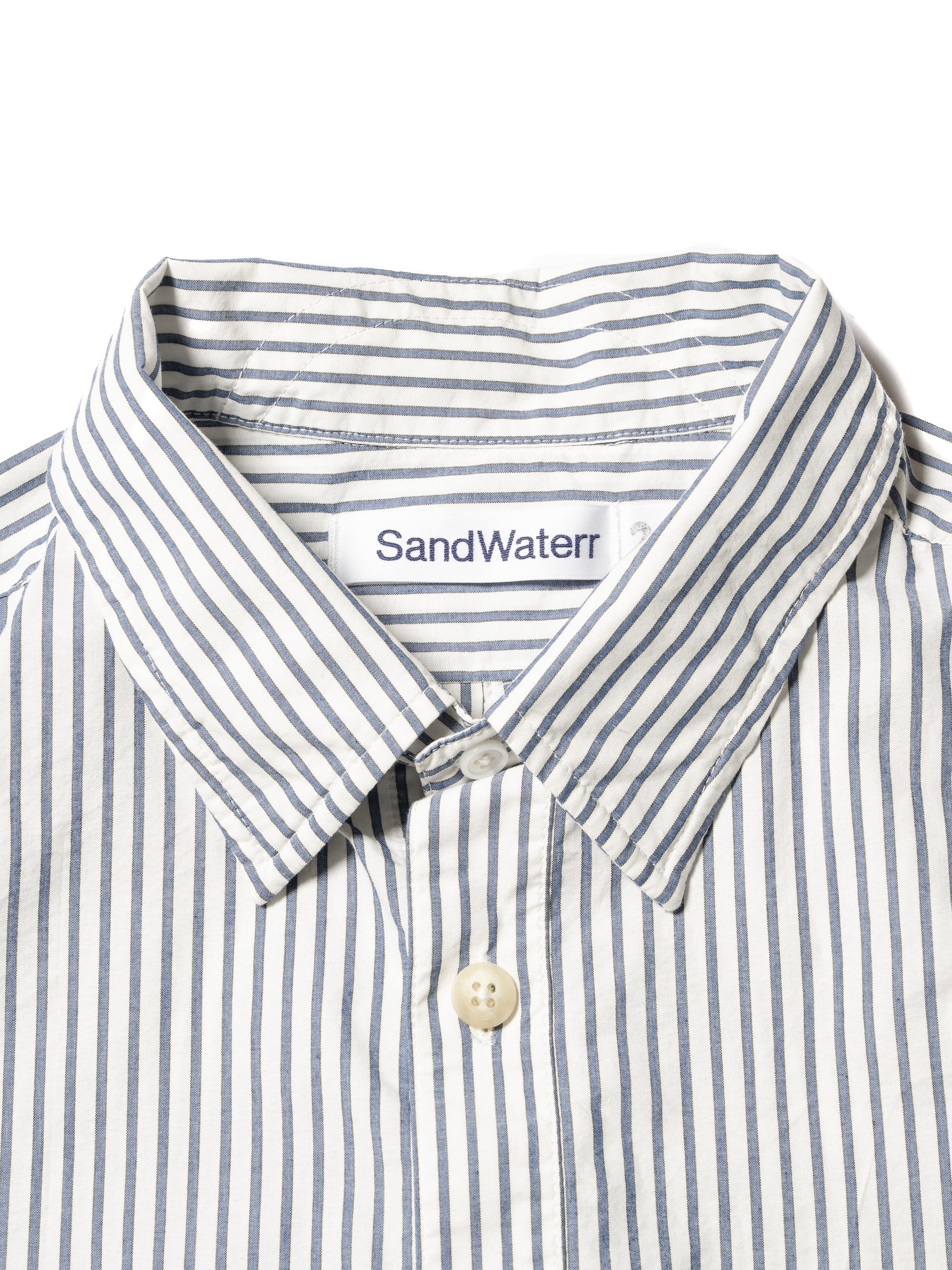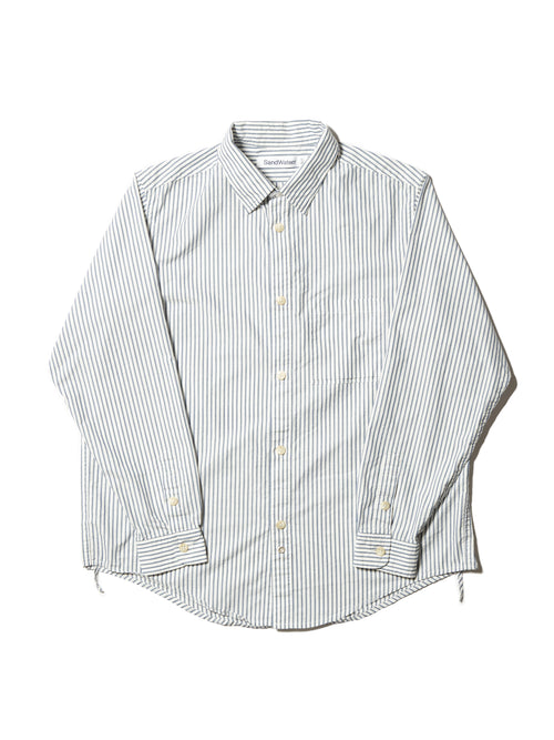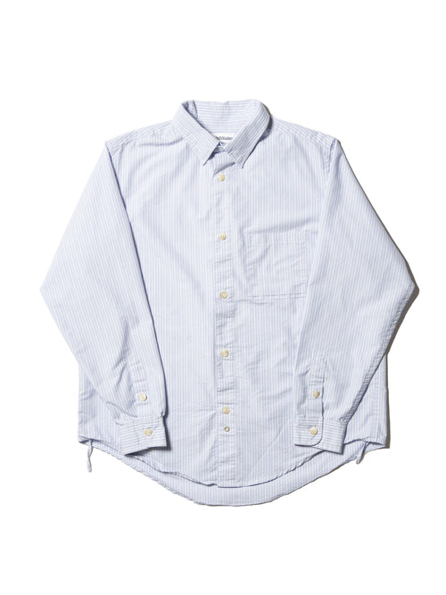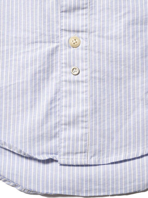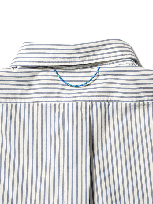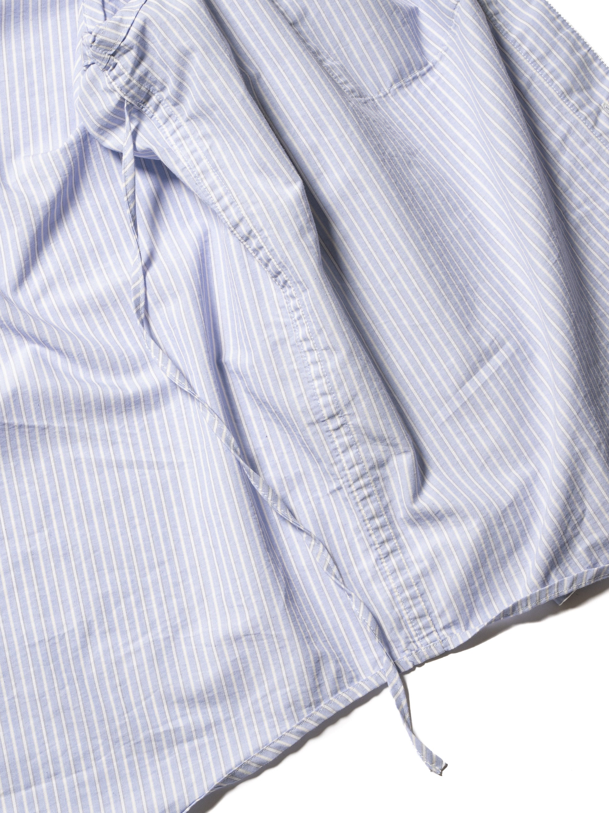 コットン、ポリエステルがミックスされたストライプ柄ブロード地を使用しています。ウォッシュ加工を施し、古着の様な愛着ある風合いにしています。襟先に隠しボタンが付いたB.D.仕様が特徴的。内側脇下にあるコードは腰巻きなどに使用します。前立てにはシルバーの飾りボタンを装備。身幅は程よいゆとりを持たせたシルエットです。